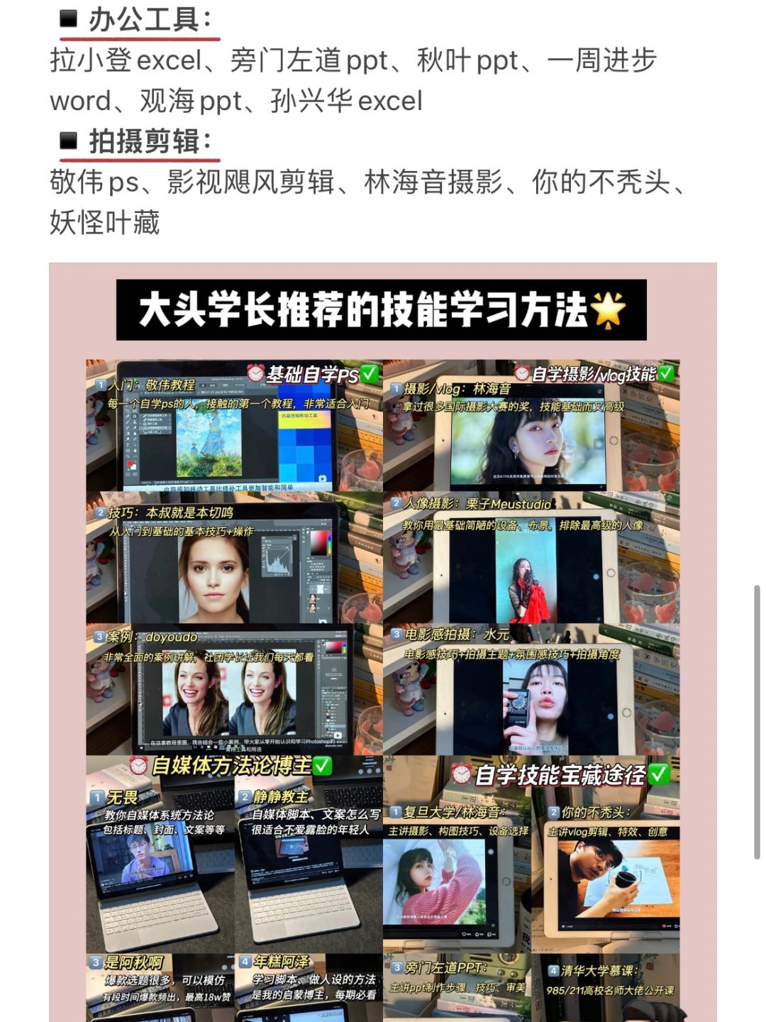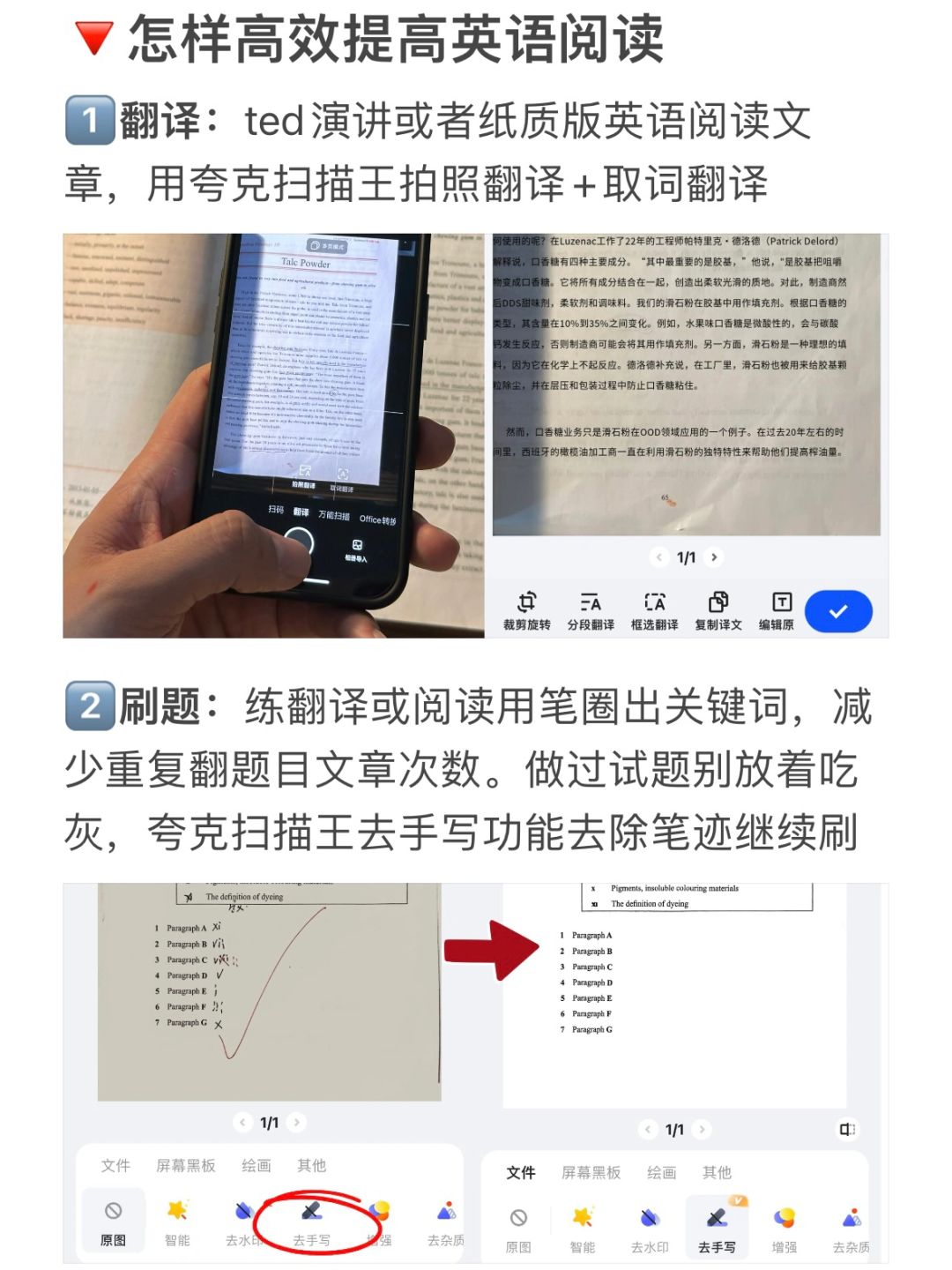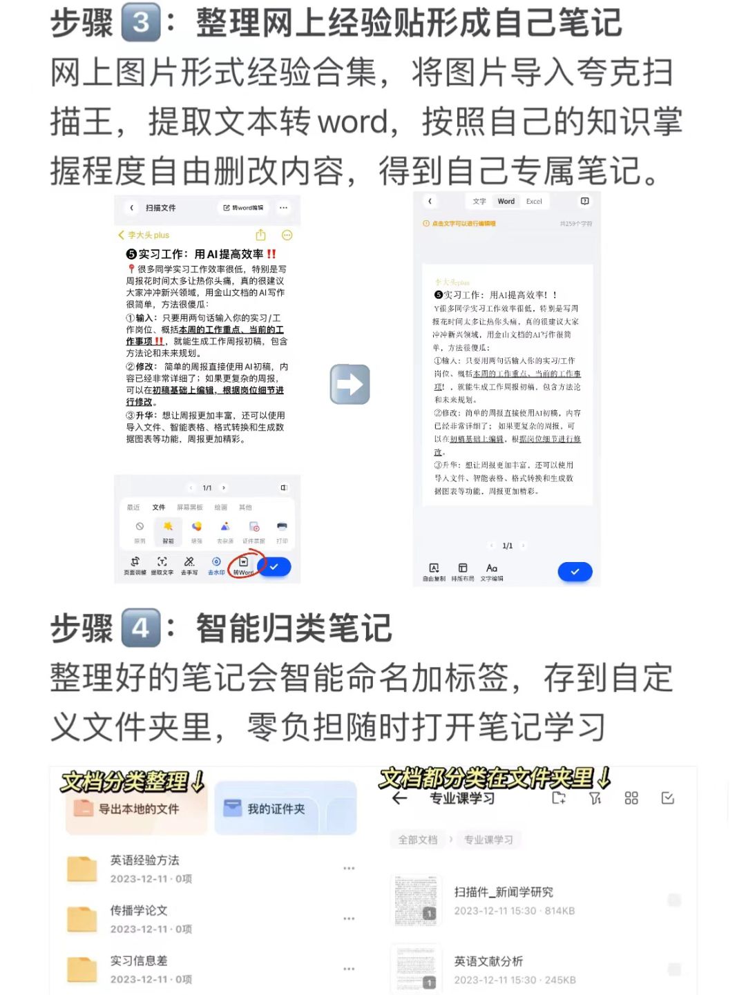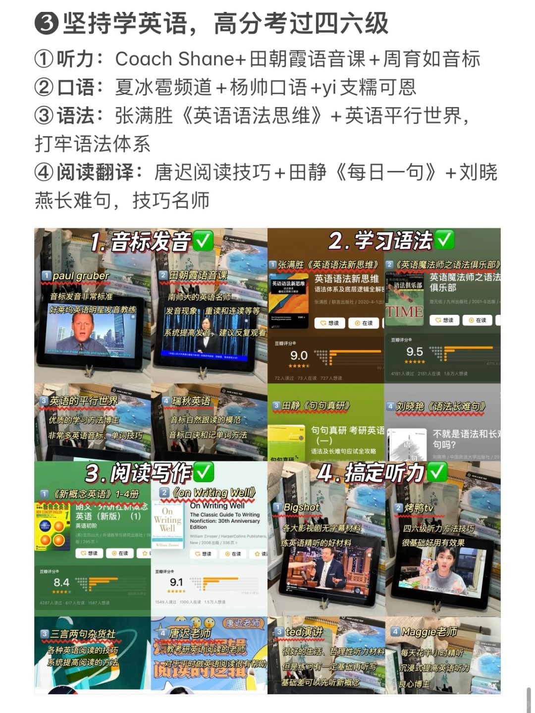 我是大头学长,二本上岸北外研究生。 大一我在社团采访时,遇到一个学霸师兄:他是个二本男生,大一成绩一般、大四却强势保研985。他告诉我,做了3件事逆袭: . ①申请寒暑假社会实践,云南调研一个月,项目4年拿3个大奖 ②加入老师课题组:积累科研成果,研究生复试逆袭 ③坚持学英语,大一四六级600+,缩小与名校生差距 . ❶做好规划,是大二拉开差距关键 ①吃透专业课: 上课做好笔记+看5本名著拓展知识,大四考研会轻松很多 ②成绩专业前5: 上课多回答问题+平时作业分拿满,期末认真背;吃透奖学金文件,对保研留学考研很重要 ③参加寒暑期社会实践: 报名三下乡社会实践,认真做项目,大二比赛和大创 · ❷接触项目,积累科研经验 进老师创新团队,有很多项目;大一跟学姐参赛,积累经验;大二核心带队参赛,拿奖+学校资源 ①论文工具:万方、知云、镝数据 ②办公工具:拉小登、旁门左道、王佩丰 ③作图工具:敬伟、影视飓风、林海音 . ❸坚持学英语,高分考过四六级 ①听力:田朝霞语音课+周育如音标 ②口语:夏冰雹频道+杨帅口语+一支糯可恩 ③语法:张满胜语法思维+英语平行世界 ④阅读:唐迟阅读+田静每日一句+刘晓燕长难句 . 方法: ①学经验要科学做笔记:网上图片干货,不用敲字整理,导入夸克扫描王提取文本转word,删改、标注重点生成专属笔记。笔记会智能命名加标签,存到自定义文件夹随时学习,智能文件处理效率高 ②翻译TED文章:先逐字逐句翻译,再用夸克扫描王拍下全文秒出翻译,不用挨个查意思,对照订正。还能单独取词翻译,专业名词翻得很准 ③练翻译阅读题:用笔圈出关键词,避免重复看题。做过的试题用夸克扫描王去手写功能去除笔迹,二刷巩固知识,也可用夸克APP里夸克扫描王 · ❹不要局限课堂,自学名校课 ①数学:山财宋浩、李永乐线代、王式安概率论 ②文学:华师戴建业、南开叶嘉莹、北大杨宁 ③新闻:北大王晓红、复旦黄瑚、中传胡正荣 ④考研:唐迟阅读、石雷鹏作文、朱伟单词、汤家凤数学