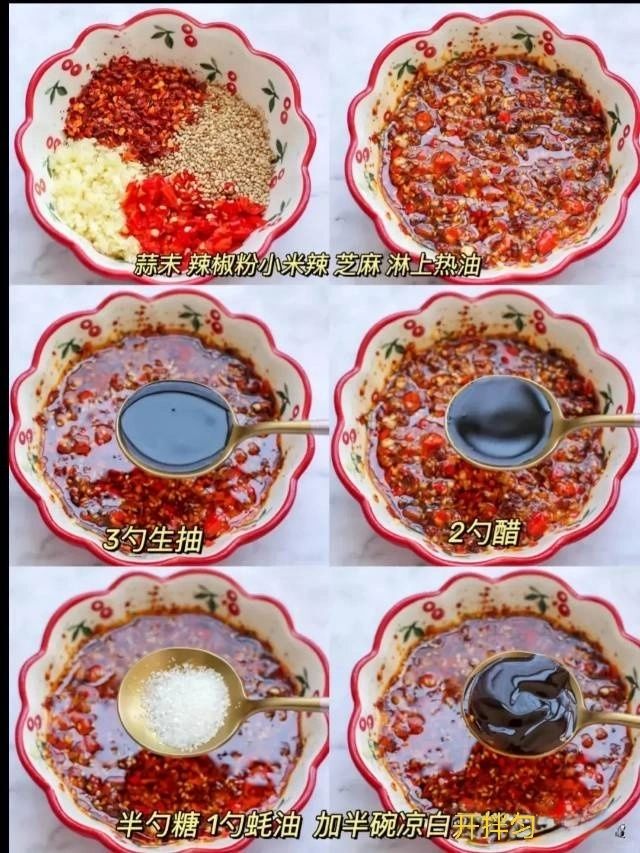[二R]酱汁:碗里准备蒜末、辣椒粉、白芝麻,小米辣,淋上热油,加3勺生抽,2勺醋,1勺蚝油,半勺白糖,适量盐,加半碗凉白开水搅拌均匀。