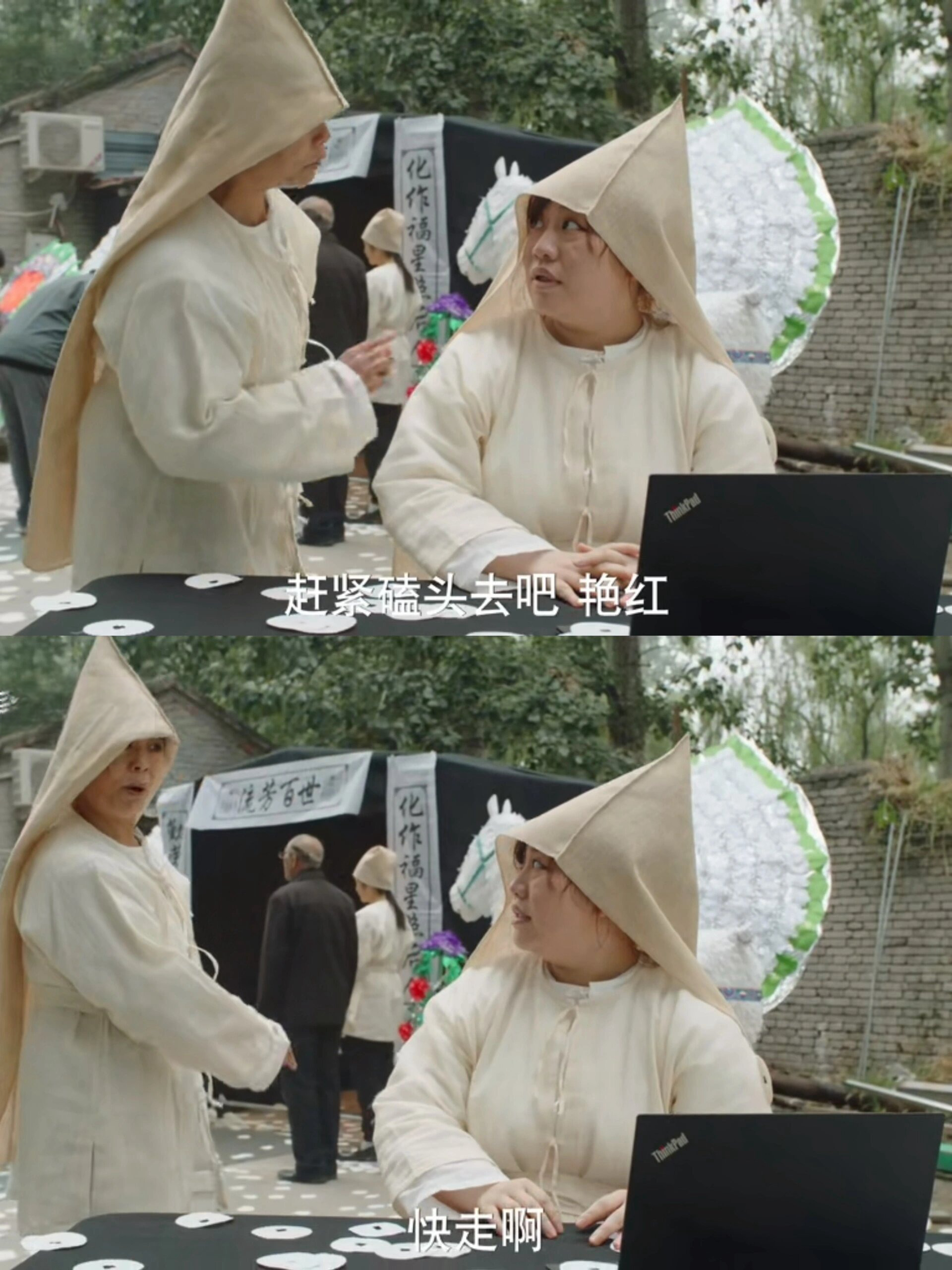 穿着丧服后面还有唢呐的声音
