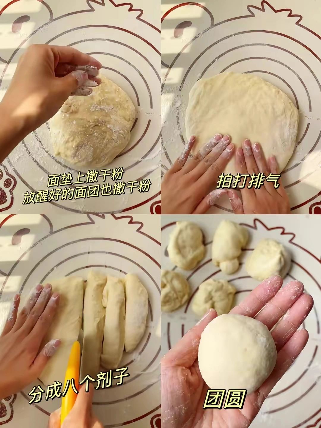 [二R]:面垫上多撒点干面粉,醒好的面团倒扣上来,面团上也撒上干面粉,不用揉,直接用手轻轻拍打排气,切刀分成8个小剂子,都搓成圆球状;