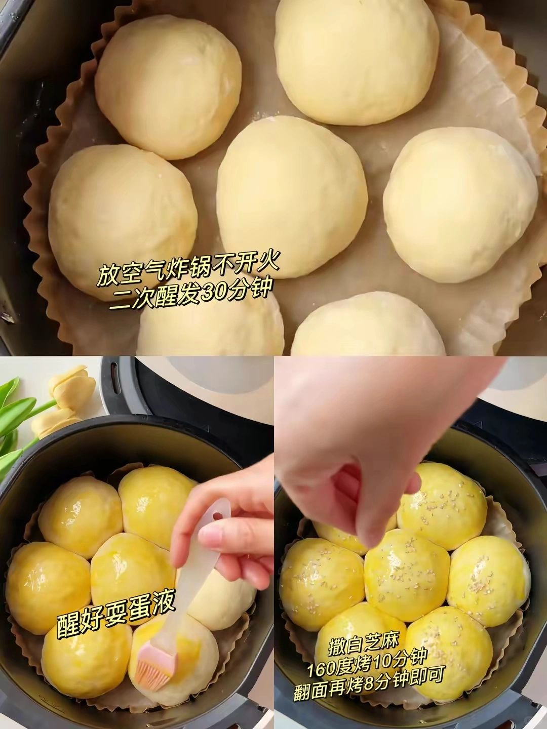 [三R]:把团圆的面团放进空气炸锅,不要开火,二次发酵30分钟;发酵好表面刷一层蛋黄液,撒上白芝麻,160度烤10分钟,翻个面再烤8分钟即可完成!