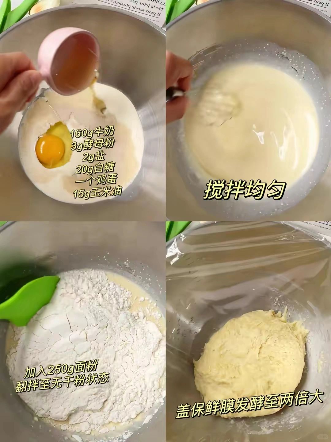 [一R]:小盆里加入160g纯牛奶➕3g酵母粉➕2g食用盐➕20g白砂糖➕一个鸡蛋➕15g玉米油,充分的搅拌均匀,搅匀后再加入250g普通面粉,翻拌均匀至无干粉状态,盖上保鲜膜发酵至原面团的两倍大;