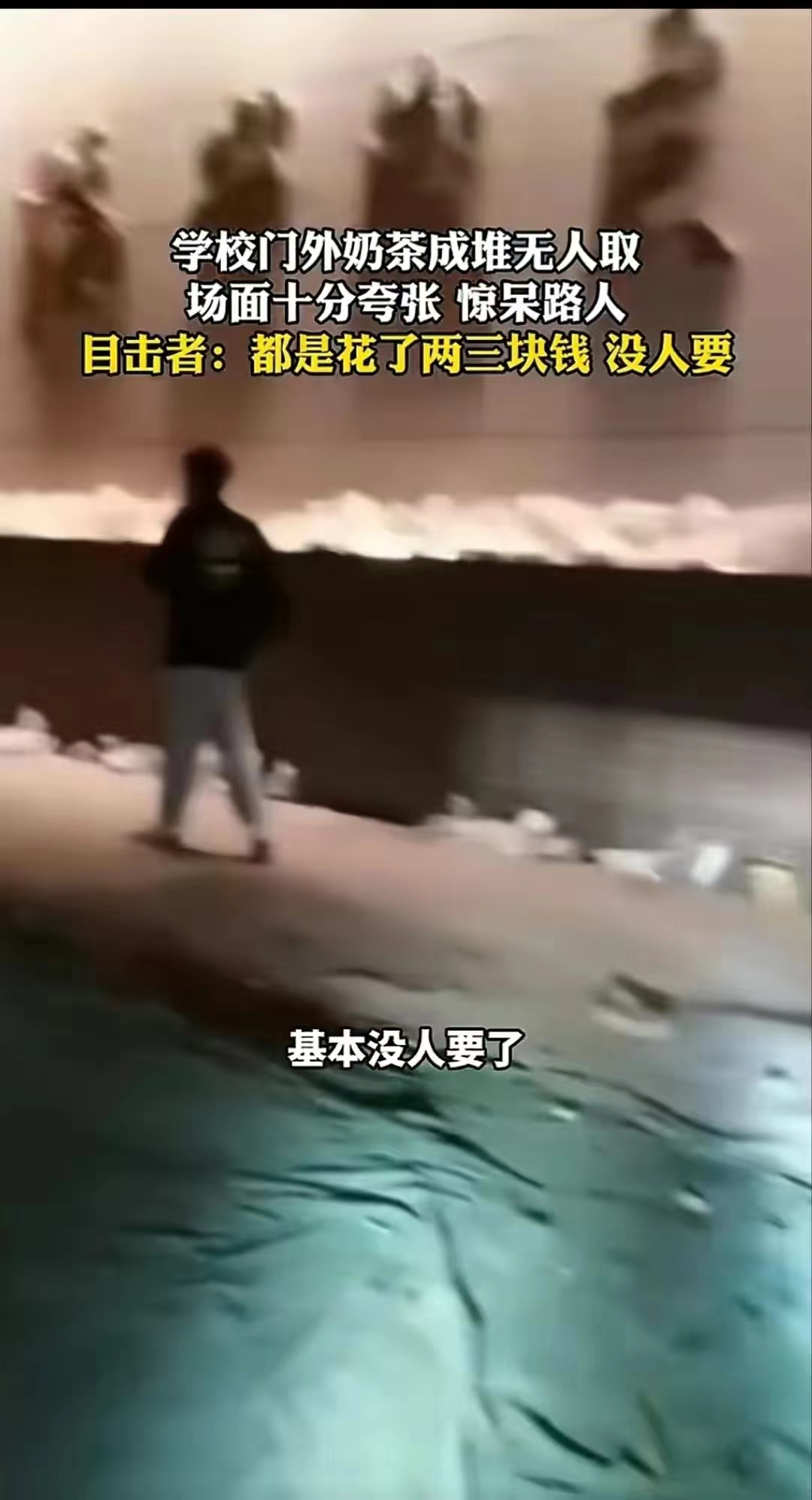 在山西太原一所高校的门口,也可能是类似于中专学校或者其他类型学校,需要大门下面密密麻麻摆着各种的奶茶果茶,但是也无人取了,也无人整理,场面太夸张惊呆路人。看上去肯定不是一天的量,估计还有前几天的都在那放,只不过现在天还不热,他并没有发出异味。