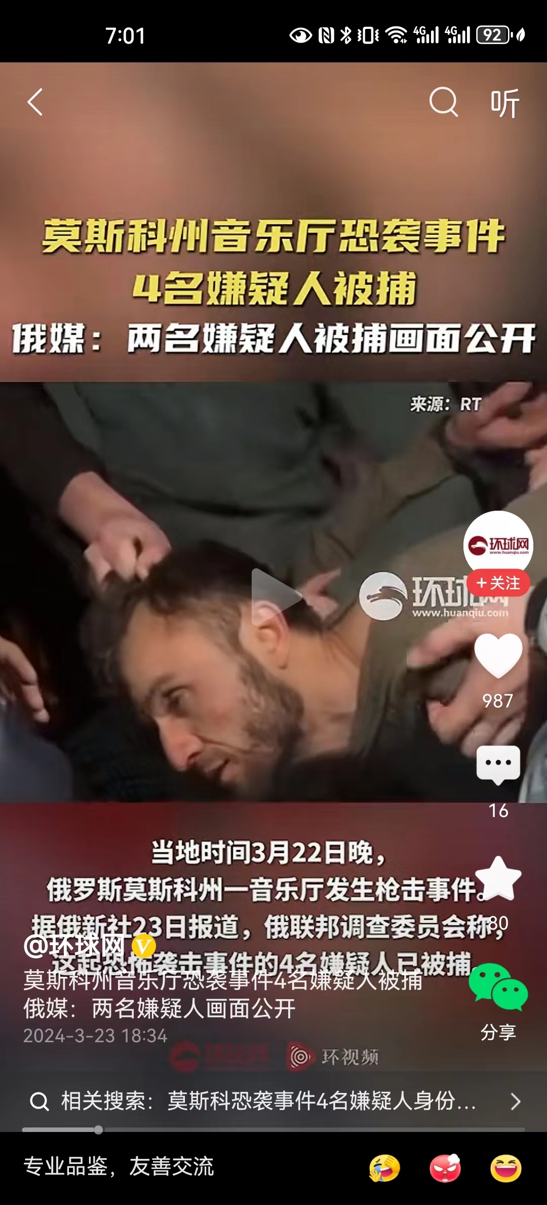 #俄音乐厅恐袭事件已有11人被捕#俄罗斯已经发布被抓的两人画面,而且已经拦截4名嫌疑犯向乌克兰方向逃匿。这个事件影响巨大,现在已经有150人死亡,受伤人数还没有公布,后续不排除还有更多的人死亡。假如这个事件同乌克兰方面有着联系,我们可以想象未来两国的冲突将快速升级。整个世界局势将重新转变。