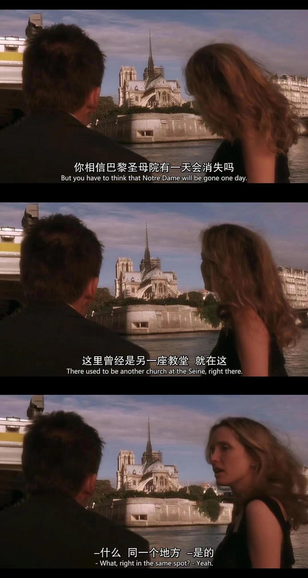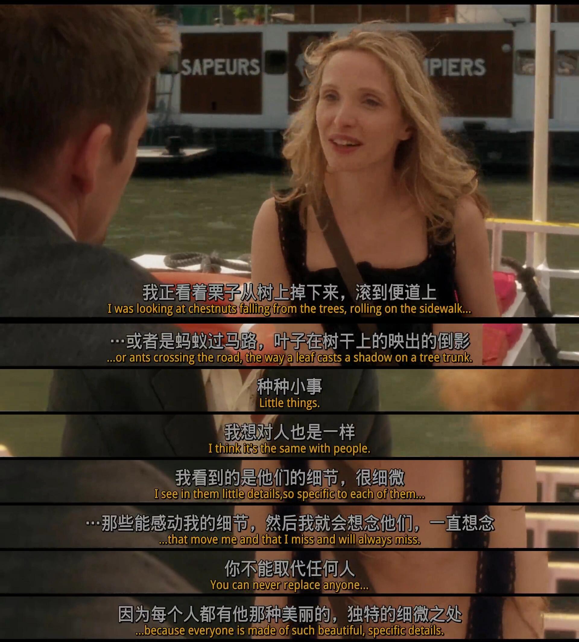 九年时间,物是人非。男主按照自己心中完美的方向就业娶妻生子,成为畅销书作家,他说他不爱妻子,但是觉得那是一种责任,他爱他的儿子。而女主在勇敢地追求自己心中真正想要的事业,她为环保组织服务,用一些实际的行动去真正改善世界。她在做着很有意义的工作。“真正能改善世界的工作,是日复一日的点滴进步。”在咖啡厅里她手里夹着香烟,非常酷地说出来这句话,理想主义的责任感与现实的行动在她身上巧妙地融合起来,我真正感受到了她的魅力。但是在择业方面做出勇敢选择的她,在爱情方面却有所保留。通过对男友和爱情观的描述,感觉她是那种在恋爱中也能很独立的女性,不对亲密关系抱有高期待。感动于一些小细节,或许回想起某个前任时,忆起的不是那个人的容貌,而是某一个和他相处的瞬间。在男主送她回家的路上,女主积压的情绪终于爆发,男主的再次出现扰乱了她平静的生活,男主坦言那本书就是为了找到女主所写,但现在两人之间已经错过了。两人好像都很怀念九年前那个浪漫的夜晚,男主写书记录,女主写歌纪念。在影片的最后,女主抱着吉他为男主唱了那首歌,歌曲的最后,对男主说,再不去赶飞机或许就要赶不上了。