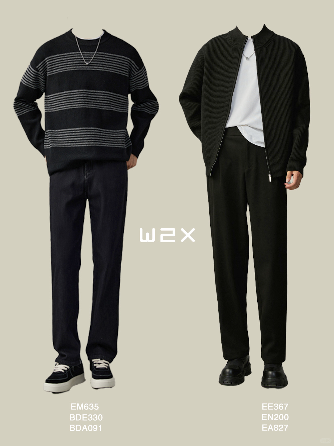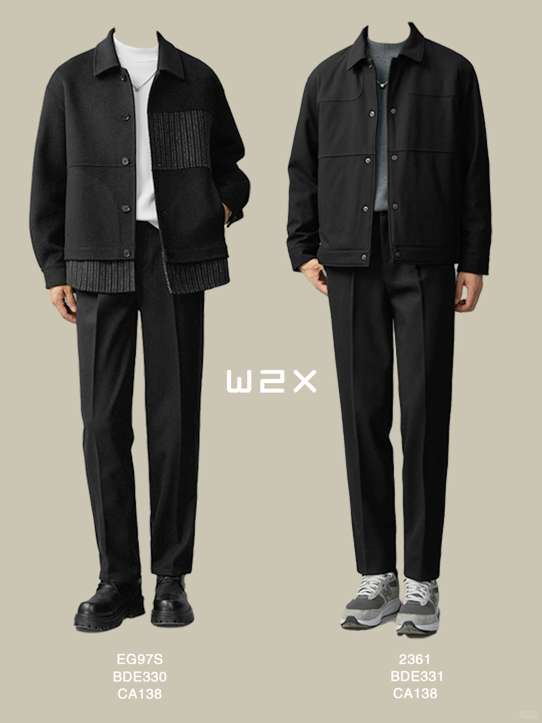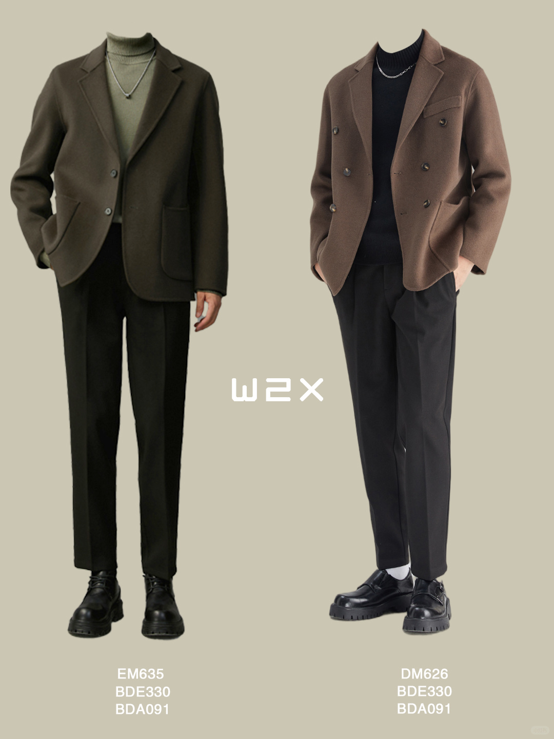 LOOK2:摩卡咖双面羊毛西服+黑色高领针织衫+黑色磨毛感休闲西裤