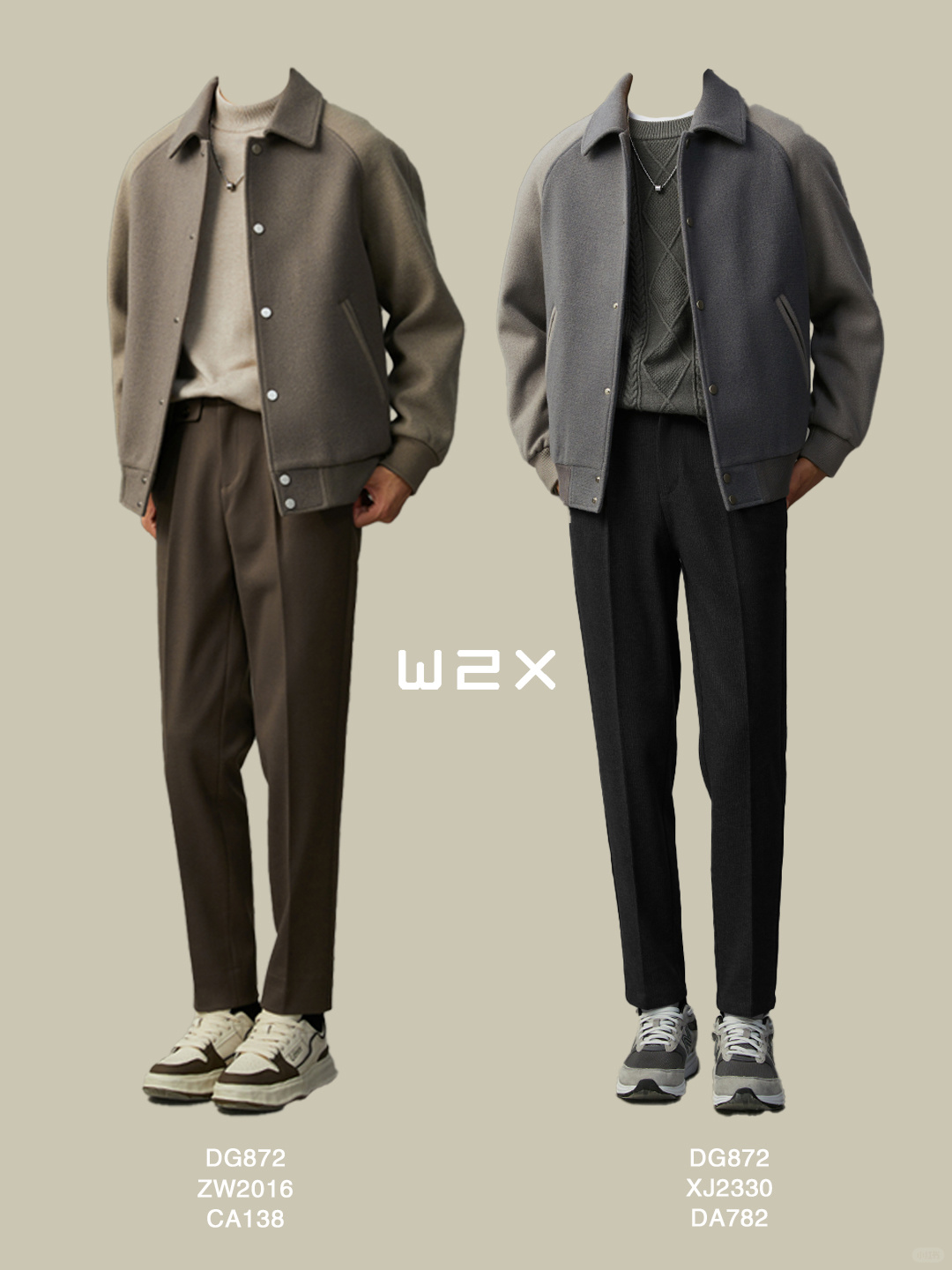 LOOK6:珐琅灰毛呢夹克+灰色圆领毛衣+黑色单褶休闲西裤