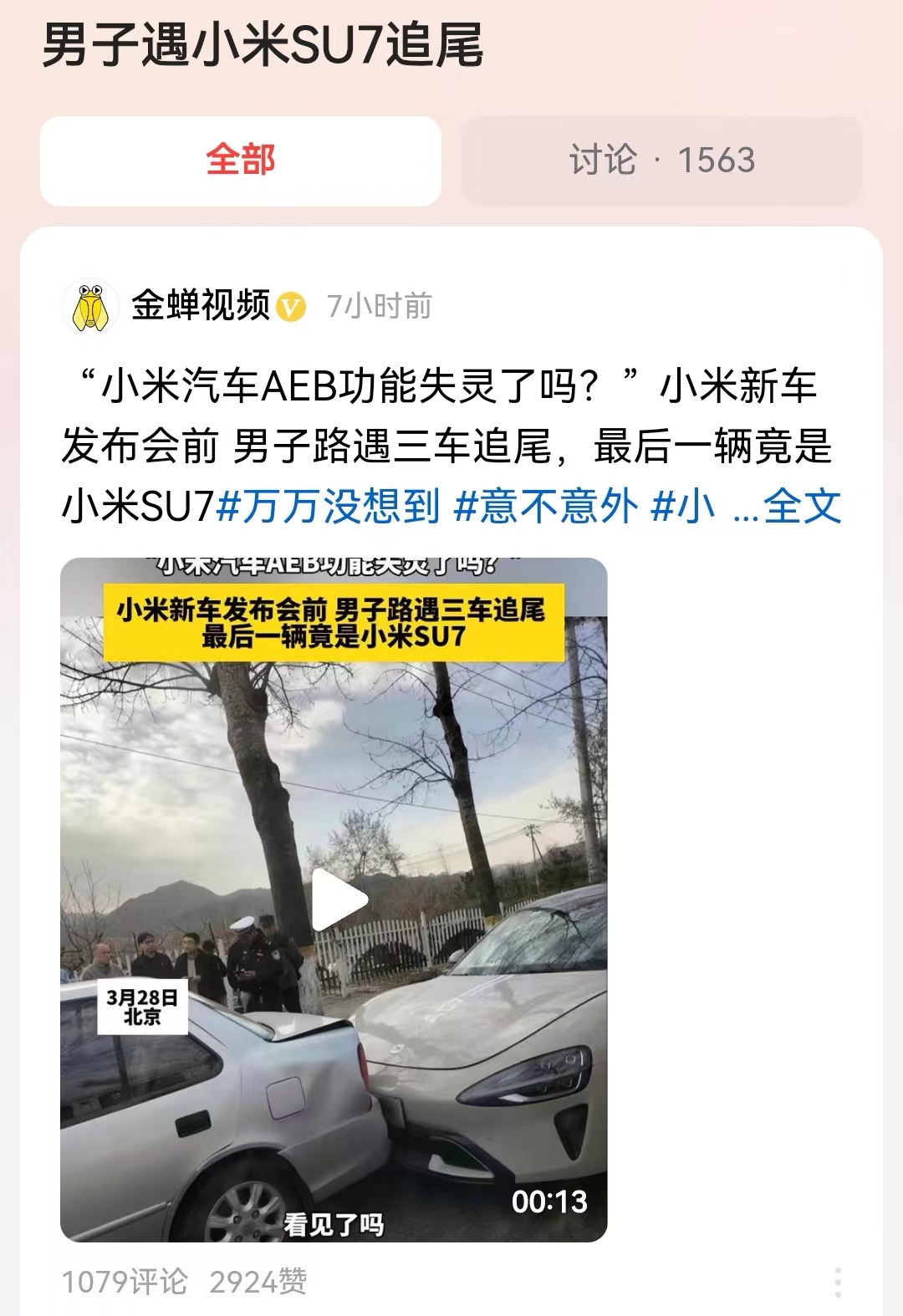 #男子遇小米SU7追尾#新车第1天,还没有挂牌,结果就追尾撞车了。北京一个网友发布视频在路上发现一个三车追尾事故,最后一部车就是昨天刚刚发布的小米汽车su7。