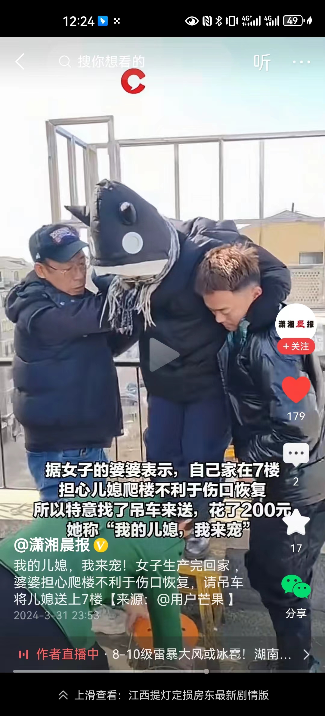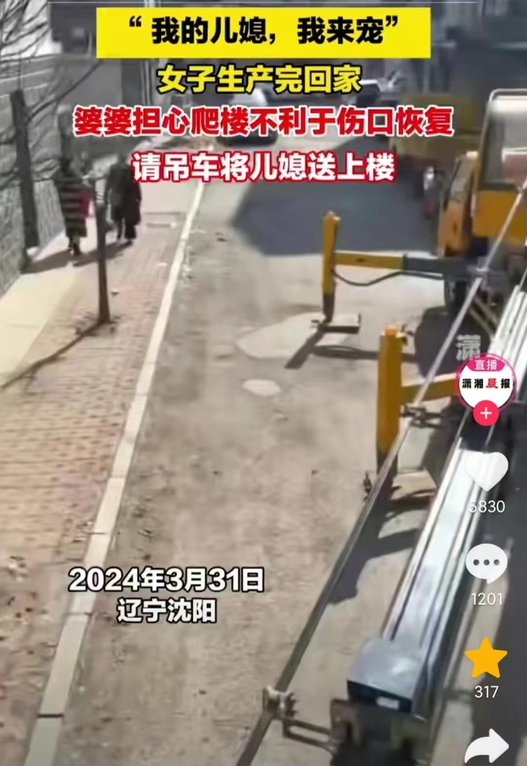 #婆婆担心产后儿媳请吊车将其送上楼#看看别人家的婆婆!给儿媳妇的待遇,相信他们绝对是和睦的一家。潇湘晨报发布,在3月31日,婆婆担心刚生完孩子的儿媳,于是在出院了回家的楼下,安排了一辆吊车,直接将儿媳吊到了7楼家中,做了一把专用电梯。