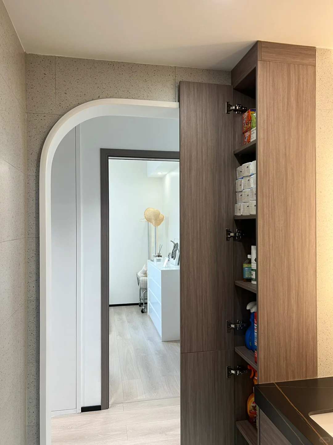 洗手台左侧预留了一个通顶的收纳柜,用来收纳各种清洁液,别看只有一点点,真的很能收纳!抽屉不要做满,避免出现卫生死角!
