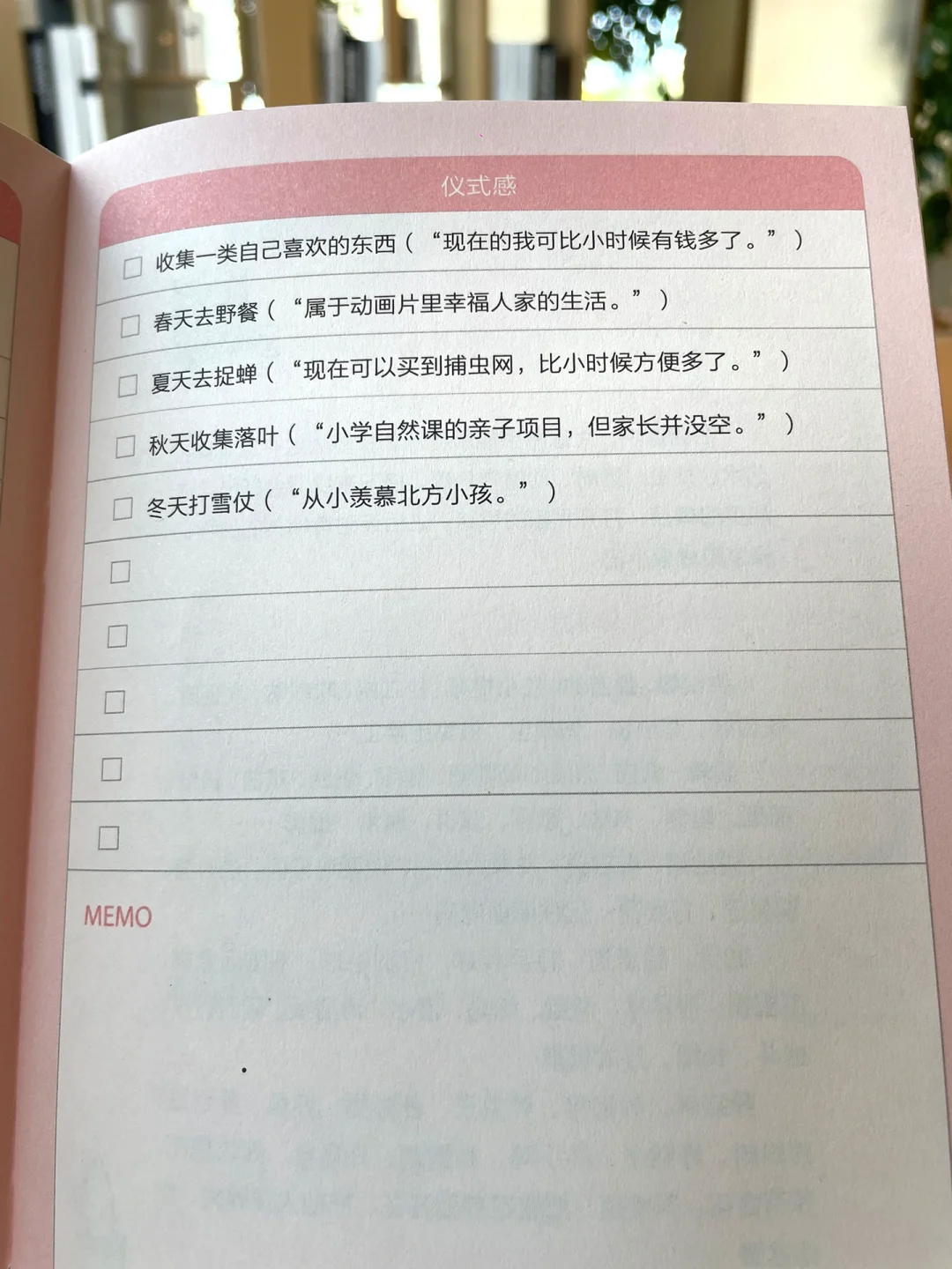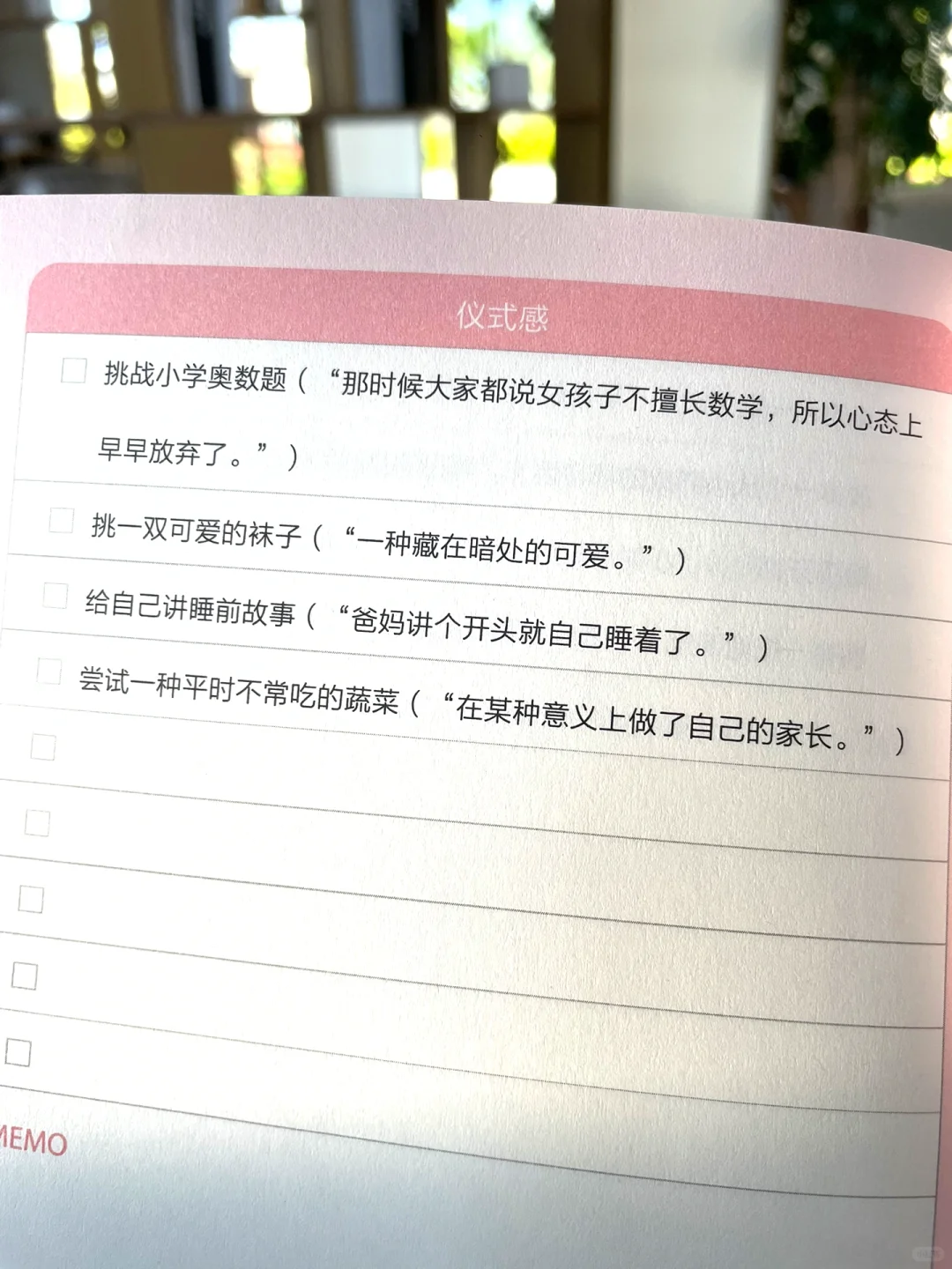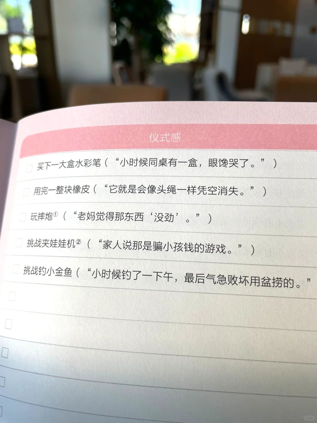 🧾她列出了“成后的再挑战清单”,为自己设定了一系列小目标,让自己成熟的一面照料那个受伤的“自己”,陪伴儿时的自己完成一个个小时候没能完成的挑战