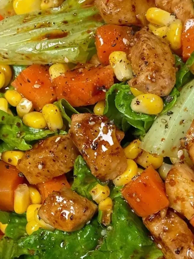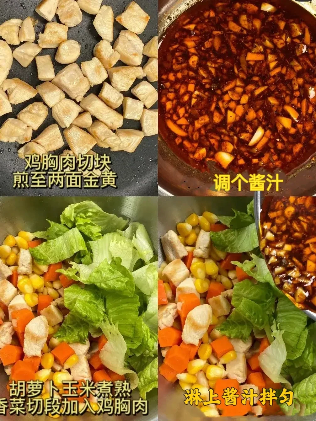 露肉的季节快到了,减掉身上多余的脂肪,来试试这个凉拌生菜鸡胸肉,太好吃啦,快乐减脂,尊享美味😁 以前特别不爱吃鸡胸肉,觉得酸酸的,肉还柴,今天这样做,百吃不厌。 🤲做法 [一R]鸡种肉切成丁腌制一下,放点盐,胡椒粉,料酒,一个鸡蛋清,葱姜,抓拌均匀腌制20分钟。 [二R]鸡胸肉不粘锅煎至两面金黄。 [三R]调个料汁,蒜末➕生抽➕老抽➕蚝油➕醋➕辣椒面,加点儿熟橄榄油浇到上面,搅拌均匀。 [四R]玉米粒和胡萝卜焯水,加入煎熟的鸡胸肉,加入生菜切段,浇上调好的料汁,搅拌均匀。