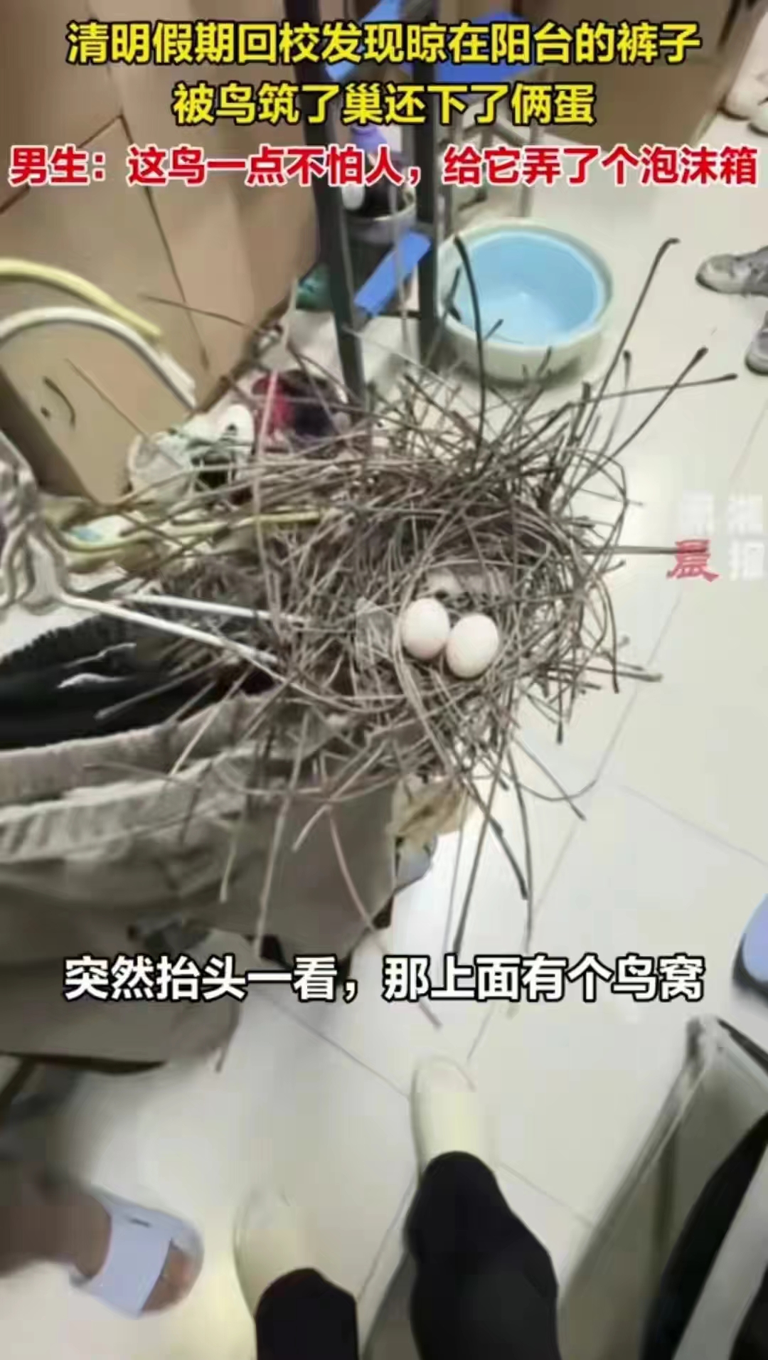 #男生晾阳台的裤子被鸟筑巢还下了蛋#这是发生在安徽铜陵某高校学生公寓的一件趣事。从这件事中可不可以说我们目前的生态环境越来越好了呢?当野生动物,尤其鸟类都不怕人了,这说明我们与自然开始和谐,我们对自然环境的保护已经深入人心。