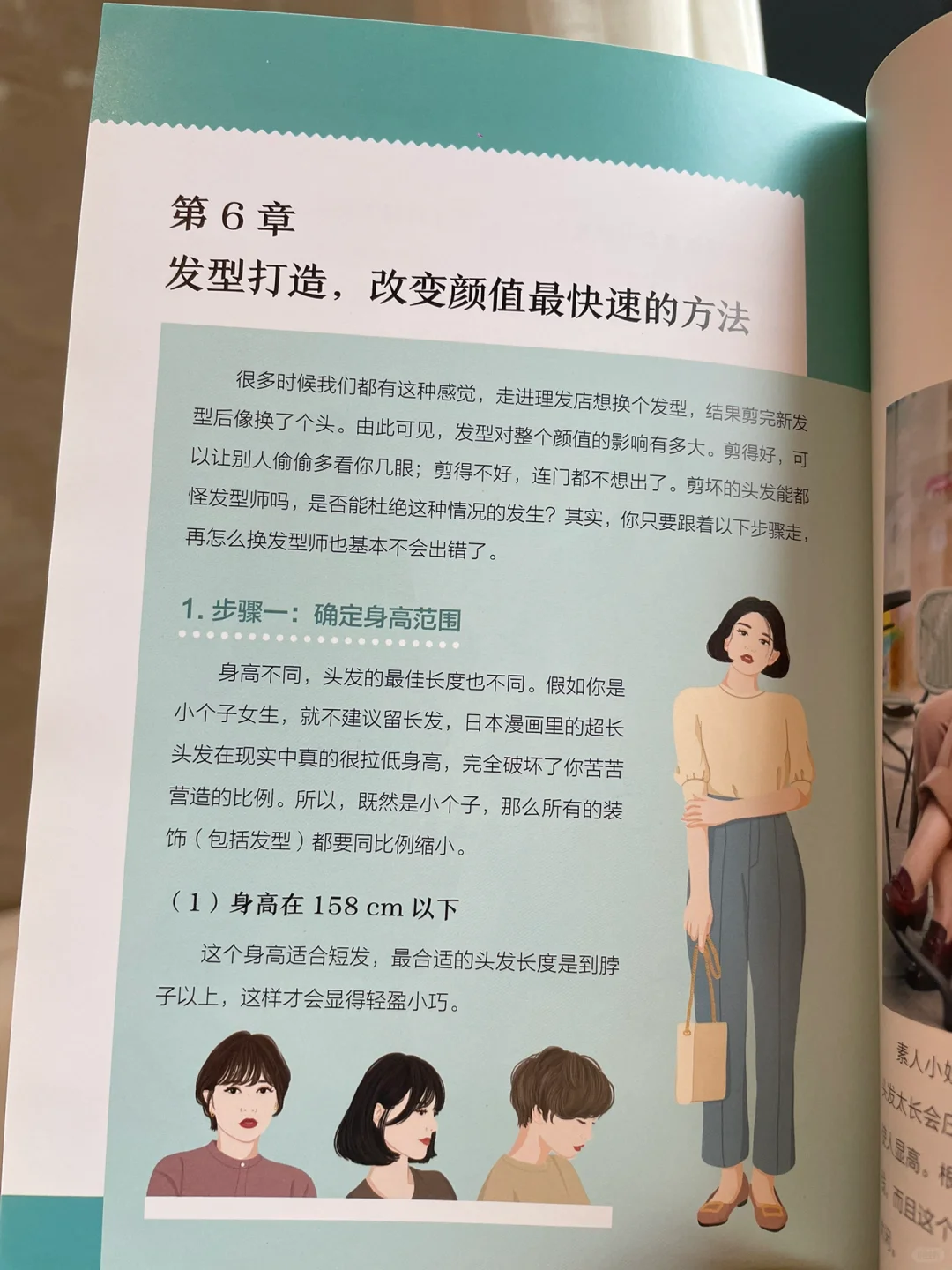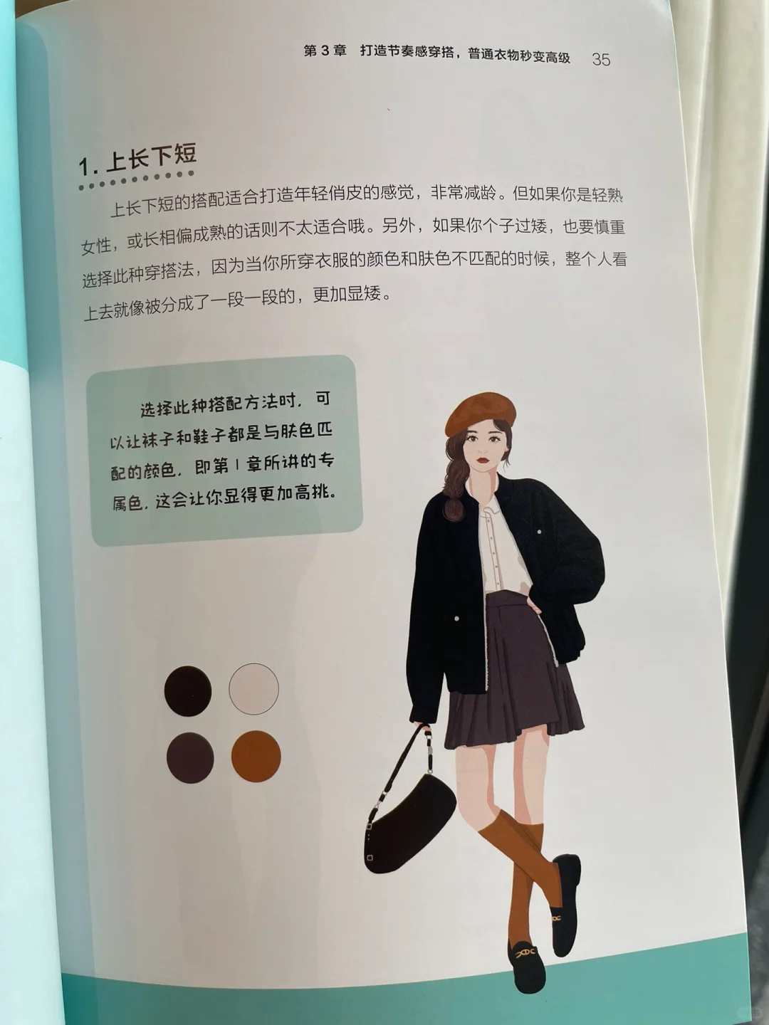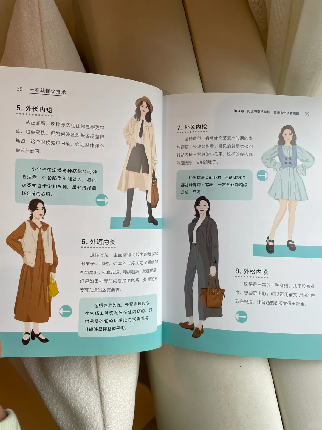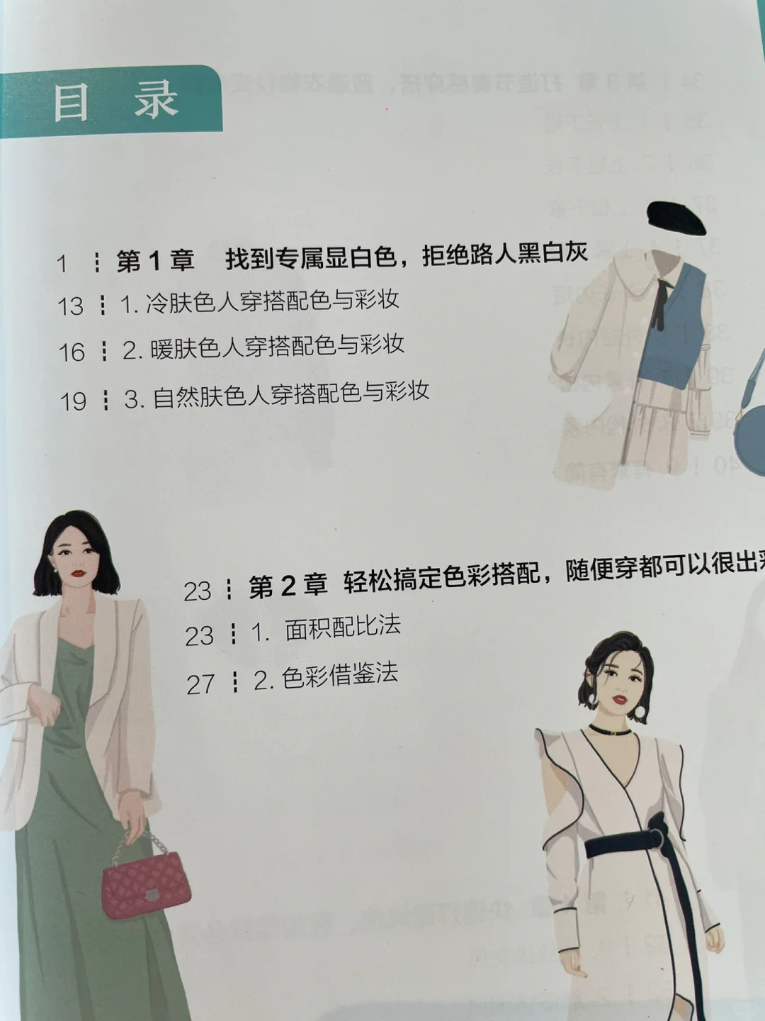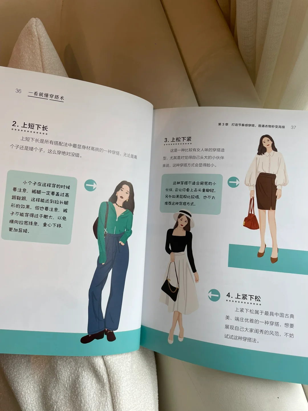 🔵肤色有冷暖,身材有胖瘦,世界上没有丑的人,只有没挖掘出自己特色的人,这本书可以说是穿搭小白的福利天花板,真的做到了保姆式教学,图文并茂,上衣穿什么?下装怎么搭?发型怎么调整?鞋子怎么配?全部都用图片呈现出了,不用靠想象,1:1照着穿就行