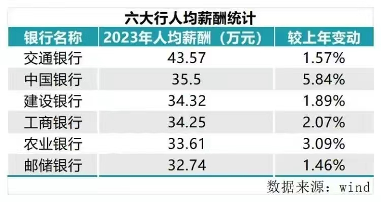 排名第一的,仍然是个人业务之王的招商银行,虽然近期原行长田惠宇被判处死缓,而且对于招行业务造成了一定影响,但是在员工薪酬方面仍然是排在银行业第一。人均薪酬为57.38万元,对比2022年的56.46万元,基本上没有太大的变化。