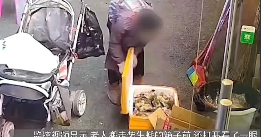 当天,老板娘将一整箱30斤生蚝放在店门口。转身就忙去了,出来找发现不见了,打开监控发现被这位老人拿走了。