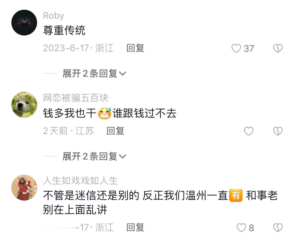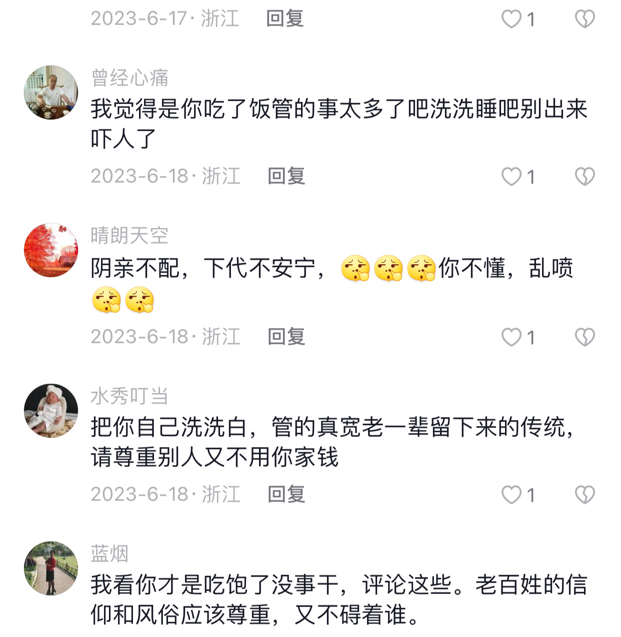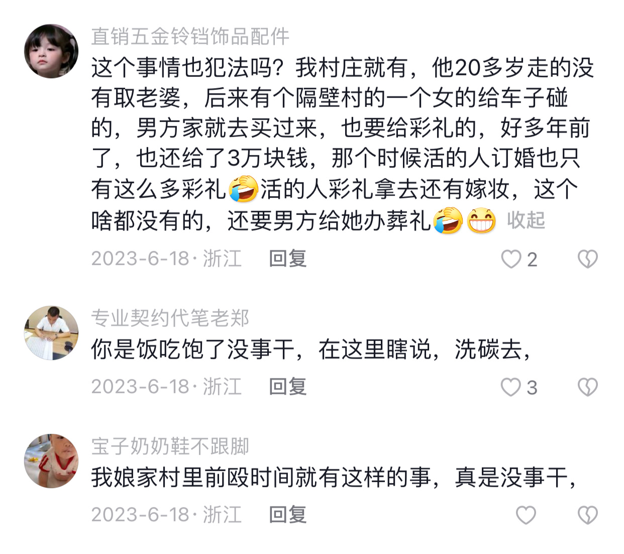 投稿,“难崩,一博主辟谣温州冥婚入赘是谣言是古时候陋习,评论区:《尊重风俗》《我**/亲戚/朋友就干过》《我也想干》《相互愿意怎么了》《又不是你家钱》”