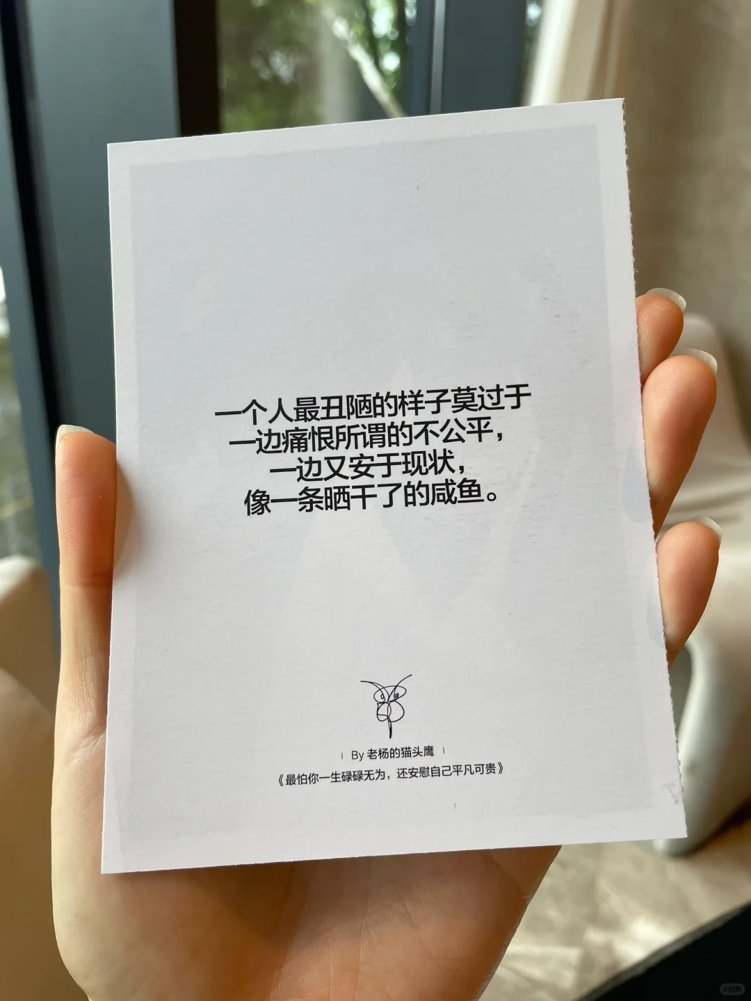 🍃一个人最丑陋的样子,莫过于一边痛恨所谓的不公平,一边又安于现状,像一条晒干了的咸鱼