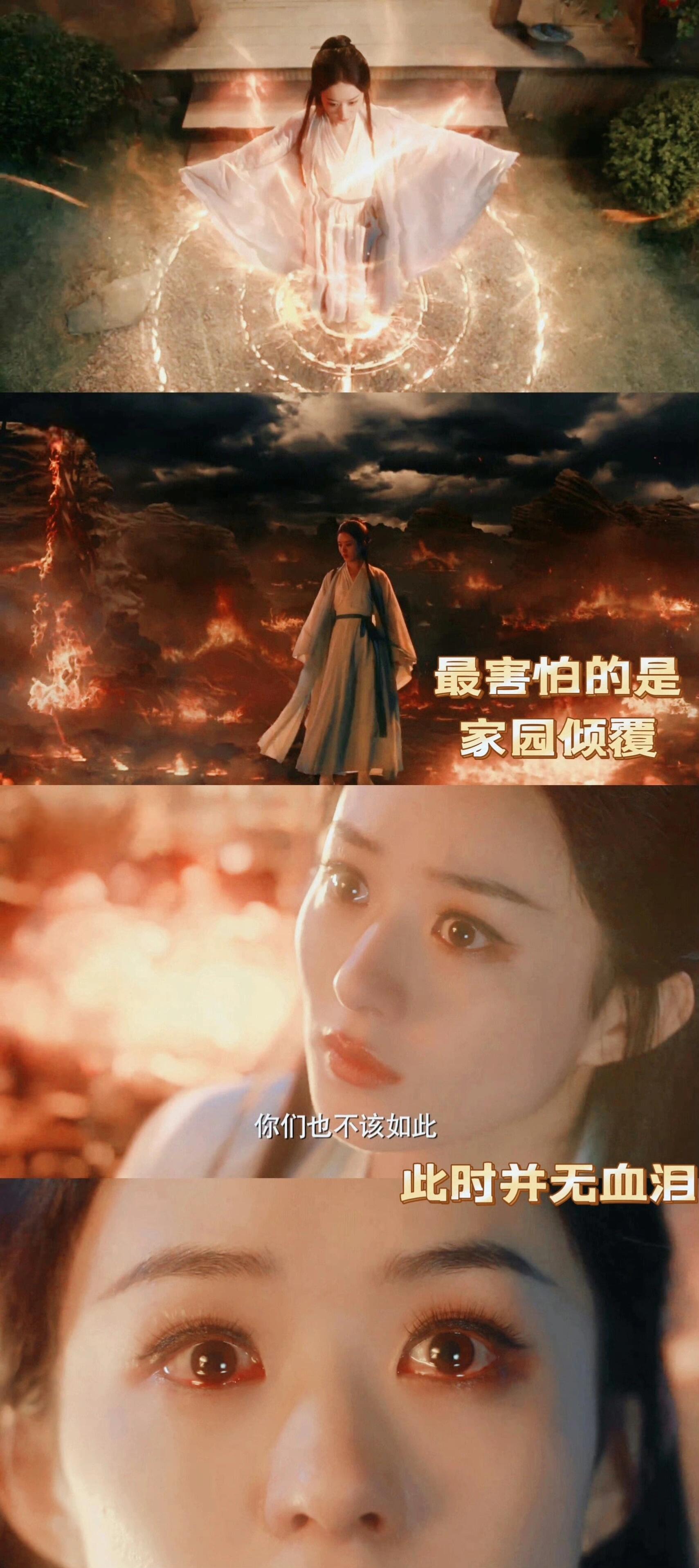 沈璃误入凶阵,所看见的最恐惧的事情是家园覆灭生灵涂炭,此时她眼中有泪。而视角脱离沈璃幻境后,沈璃眼中不仅是泪,更是血泪。接下来的镜头给到刚踏入凶阵的行云,原来凤凰泣血是他的幻境心魔。这点从二人脱离幻境,沈璃眼中澄明无血,便能看出刚才不过是行云幻觉罢了。