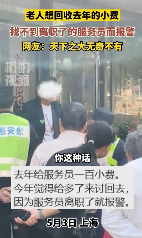 “玩不起别玩!”上海,老人吃饭给了服务员100元小费,时隔一年,老人总是过不了心里这个坎,觉得给多了,就去餐馆要回这100元小费。不料,该服务员已经离职,老人就报警求助,面对警察蜀黍的批评,老人:任何事情都要讲道理!