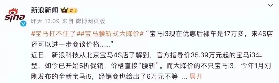 完了,17 万的宝马 i3 让无数中年中产男性失去了优越感,再也装不了逼了,以后再去大学门口,车顶放脉动红牛你好意思开宝马 i3 去吗? 不怕人家女孩子说你 low 啊? 啥年代了,还开一破宝马出来泡妹妹,老娘又不是眼瞎了,一中年油腻大叔,你有颜值吗? 凭什么? [灵光一闪]曾经怎么说也得 30 万的中产面子神车,这下好了,变成了大众消费型了,稍微咬咬牙,好像一般人一般家庭都能买了。 [呲牙]BMW 以后不能翻译成别摸我了,要翻译成不买我了。 国产车的兴起,让 BBA 代表的奔驰,宝马,奥迪正在走入垃圾时间,中产的面子工程,以后也将会出现改变,这是必然的。 [抠鼻][抠鼻]就看是华为,还是比亚迪能够抓住这泼天的富贵了。