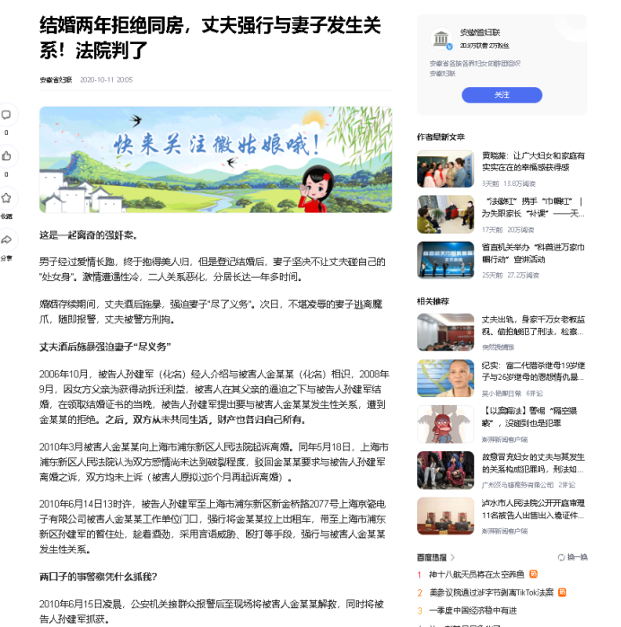 (信息来源:环球网 2020年10月10日 《结婚两年拒绝同房,丈夫强行与妻子发生关系!法院判了》)