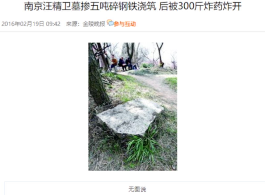 信息来源:中国新闻网原文登载于金陵晚报2016年2月19日的报道——南京汪精卫墓掺五吨碎钢铁浇筑 后被300斤炸药炸开