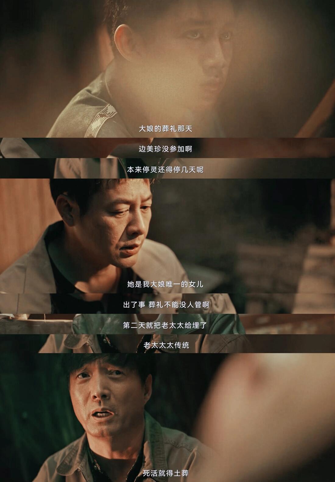 p5、p6、p9:最绝的来了,怎么处理shi才不会被发现呢?边杰的姥姥正在出殡,老太太坚持土葬。所以老金把边杰和他姥姥葬在一处了(此处是别的宝子分析得来的,宝子们真厉害)。所以老金在得知边杰妈妈在他姥姥的坟前会非常紧张。