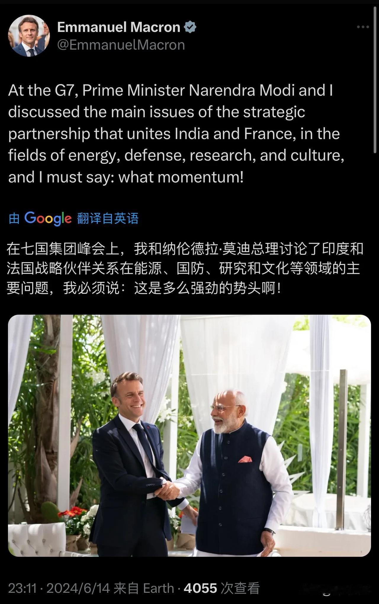 就在今天!6月14日法国总统马克龙在社交媒体上发文表示,在G7峰会上同印度总理莫迪讨论了国防、能源、研究和文化等领域的问题。马克龙认为,这是非常强劲的势头! 事实上,法印两国之间没有历史包袱,保持着总体良好的关系。这种关系的维持可以追溯到法国前总统戴高乐和印度前总理尼赫鲁的时代。法国在印度洋和西南太平洋地区仍然拥有海外领地,这些因素都使得马克龙愿意也需要在印度洋和太平洋地区保持政治影响力。