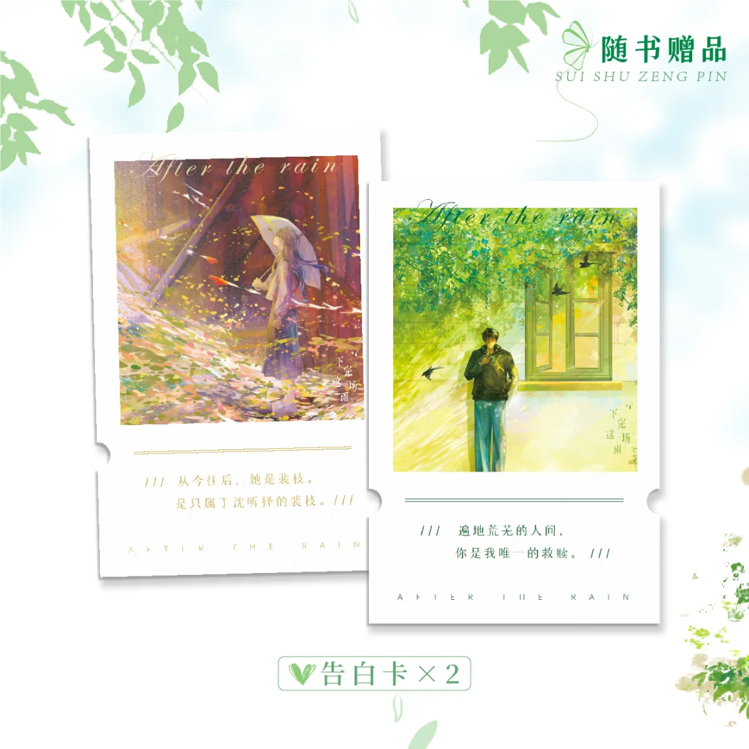 碎厌 双向救赎初恋文《下完这场雨·完结篇》6月22日19:30开售。 偏执酷哥 沈听择 VS 清冷拽姐 裴枝 极限拉扯,张力拉满! 在人间的一草一木里倒数生命,至死渴望和你有个家。 [氛围感R]开售亮点: 1.限量2000特签 2.实体图书+定制周边,首发心动价26.8元 3.下单24小时后发货 [气球R]定制赠品: 亚克力砖x1 炫彩邮票x1 双面金边细闪色纸x1 PP夹x1/碎玻璃吧唧x2 [爱心R]随书赠品: 1.精美海报*1 2.告白卡*2 3.Q版切型书签*2