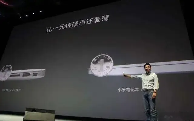 300多年后,一个叫雷军的人不知道是不是从这件事中得到了启发。他说他家的电脑比一元硬币还要薄,没错,他把硬币立起来了…
