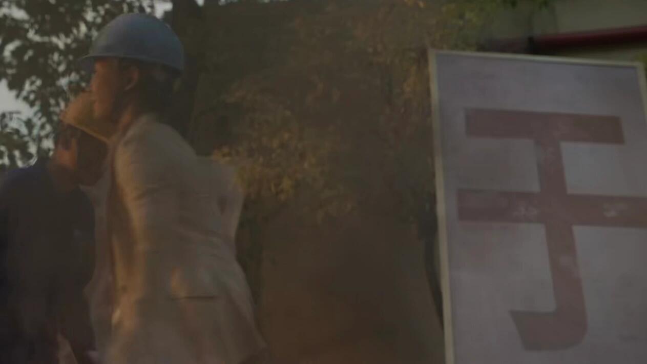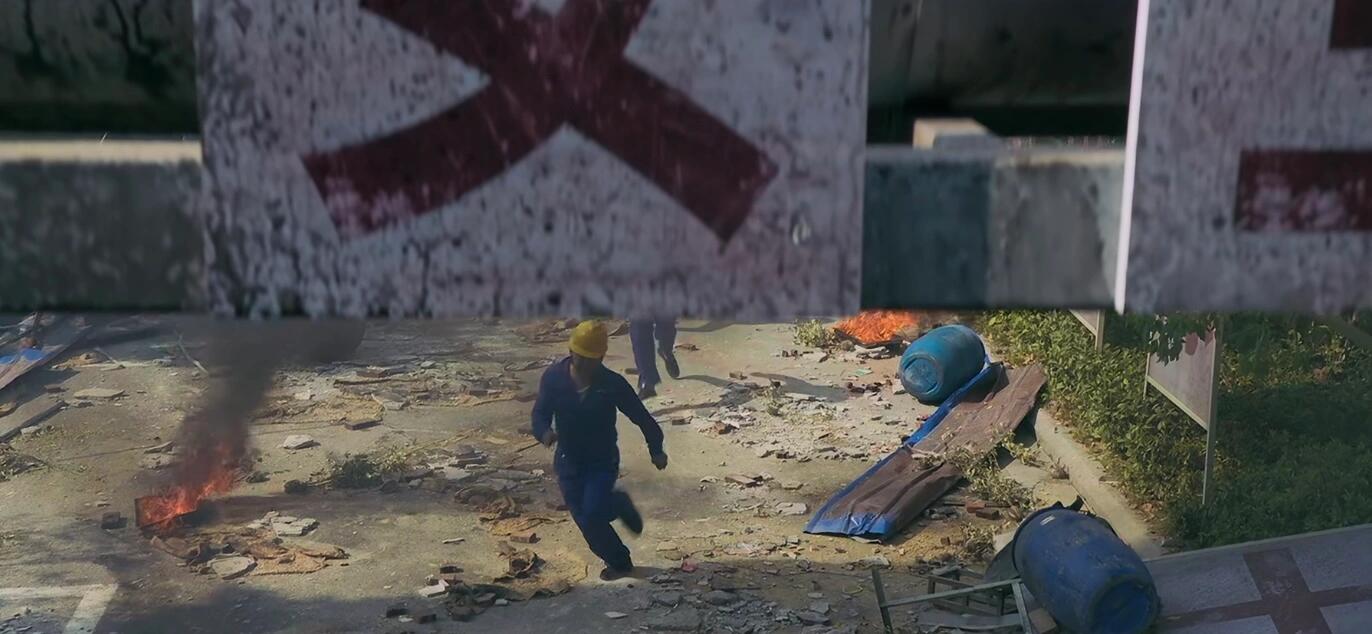 1.工人跑的时候,镜头从上往下拍到了『安全』两个字。