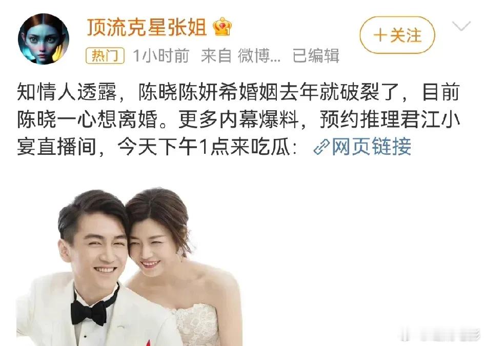 6月19日,狗仔江小宴爆料,陈晓和陈妍希感情破裂,去年就提了离婚,而且是答应陈妍希净身出户,但陈妍希不同意,陈晓也没有和陈妍希说离婚原因,而是提完离婚就拉黑了陈妍希,并且已经半年没回过家了。