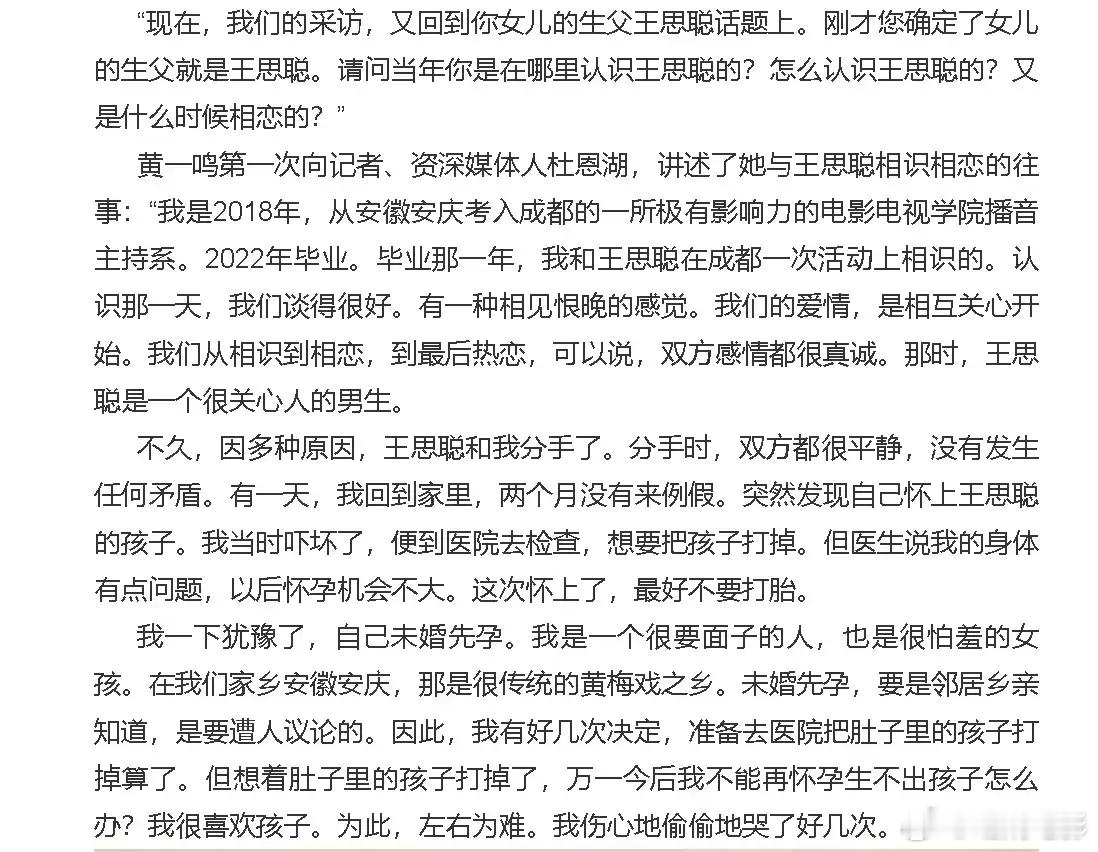 黄一鸣受访谈与王思聪恋情,并透露王思聪此前不知道她怀孕:“2022年毕业。毕业那一年,我和王思聪在成都一次活动上相识的。认识那一天,我们谈得很好。有一种相见恨晚的感觉。我们的爱情,是相互关心开始。我们从相识到相恋,到最后热恋,可以说,双方感情都很真诚。那时,王思聪是一个很关心人的男生。”