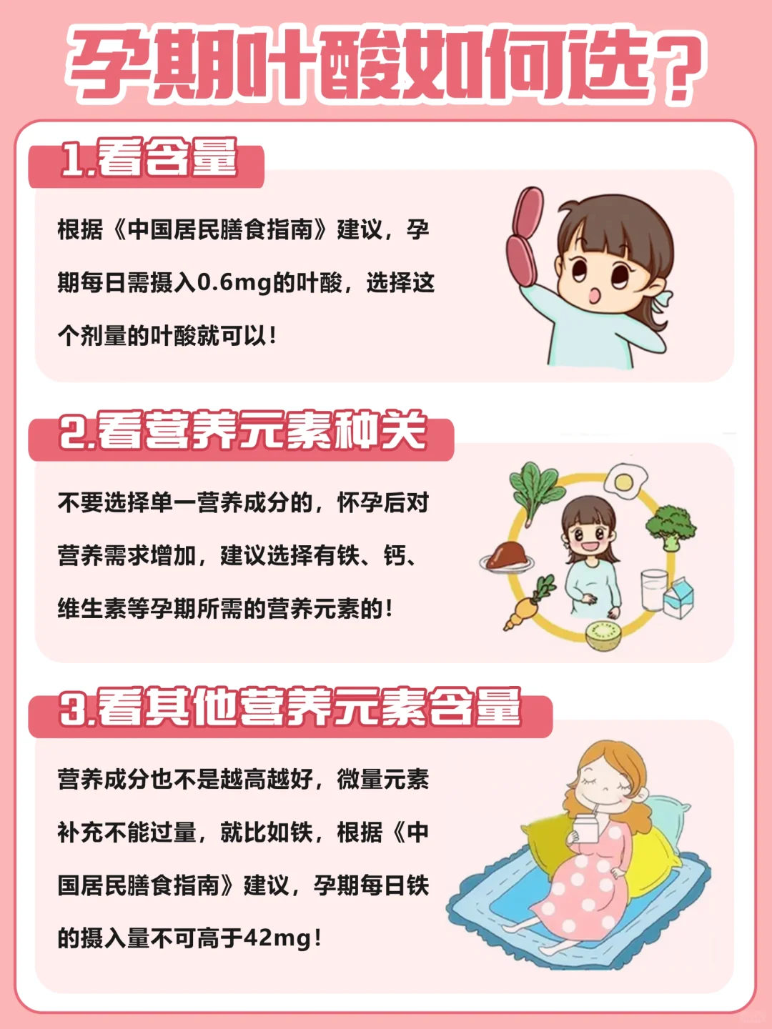 《中国居民膳食指南》建议,孕期每日需摄入0.6mg的叶酸,选择这个剂量的叶酸就可以