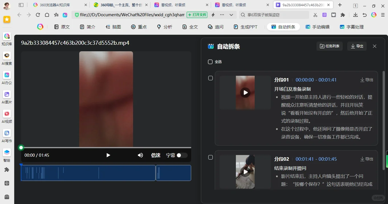 在悬疑小说的迷雾中,我们追寻着线索,试图揭开层层谜团。在现实工作中,领导的DDL可容不得我们磨洋工。要想节省时间,又高效的完成领导的剪辑视频的任务还得借助外力。360AI浏览器 视频拆条高效快捷,功能齐全,还能自动拆条,内容总结。它定能帮你提前完成工作任务,准时下班!