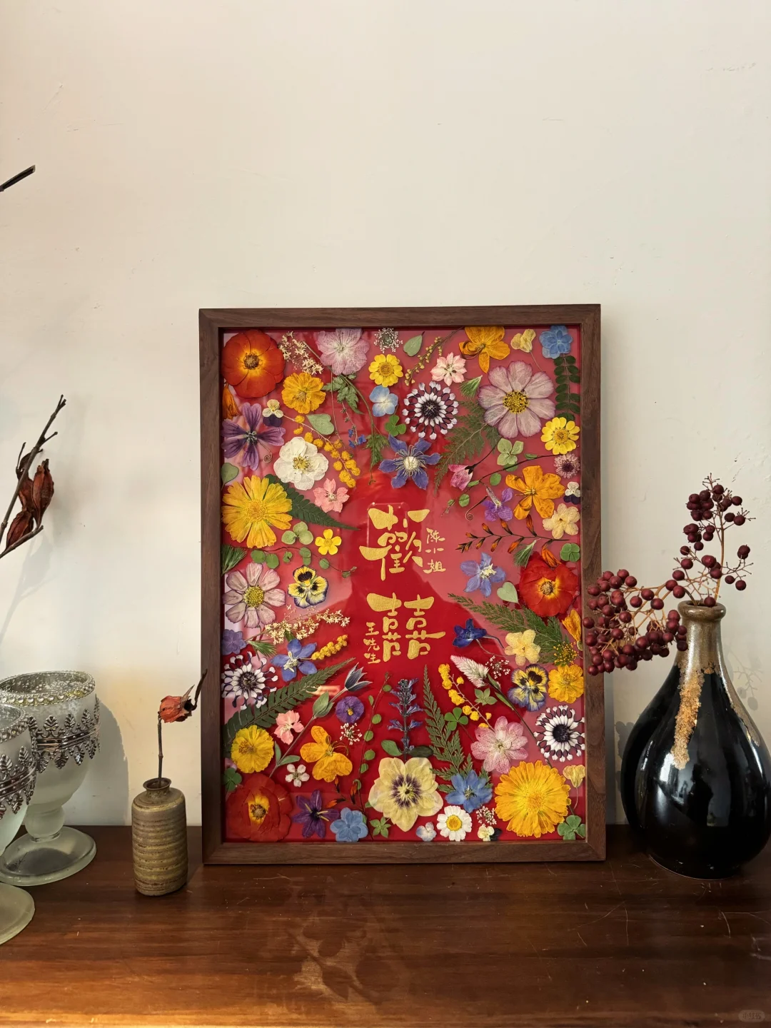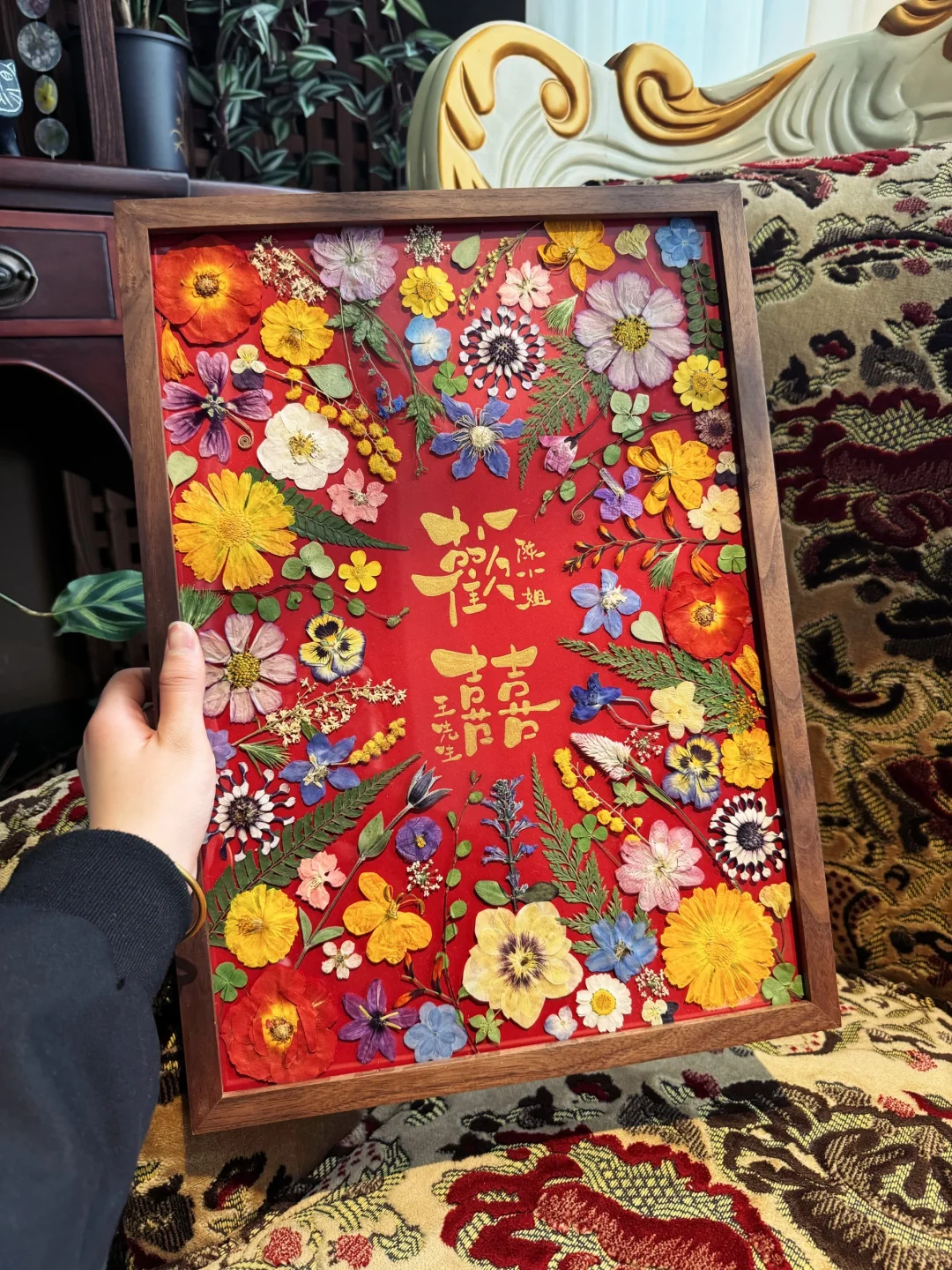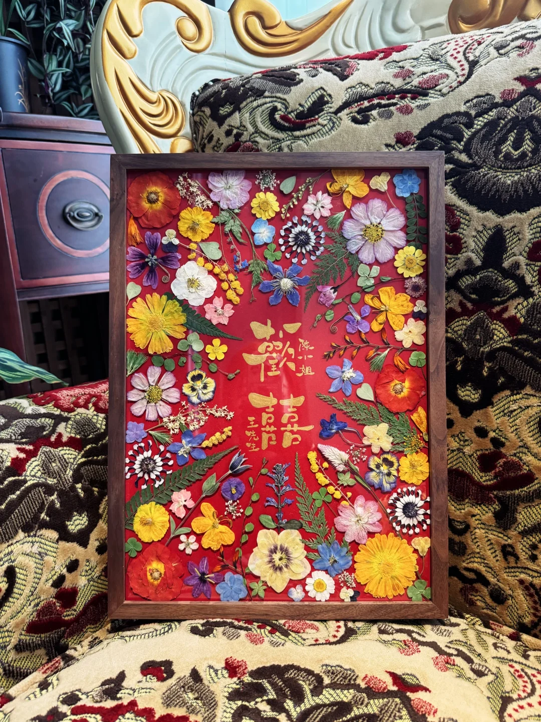 重要的不是花,是仪式感,是被惦记,是被爱! 从小到大的闺蜜就要结婚啦 ,小姐姐说她的发小特别喜欢欢喜两个字,所以我们一起设计了这款名为欢喜的压花装饰画。所有的祝福都在这幅画里了。 看天上的月,吹人间的风,过平凡的生活,只生欢喜不生愁。