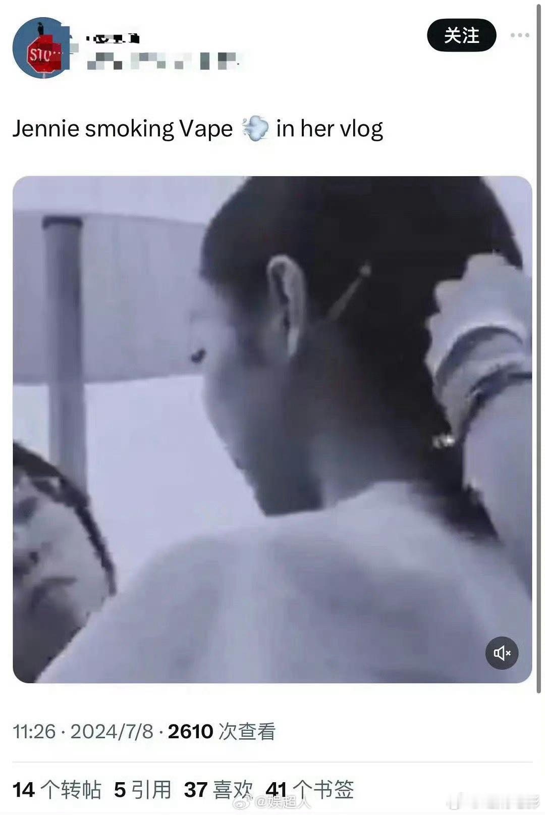 2024年7月8日,有网友发现 Jennie 工作室发出的 vlog 物料里有个一闪而过的抽烟镜头,引发了粉丝和网友的热议。
