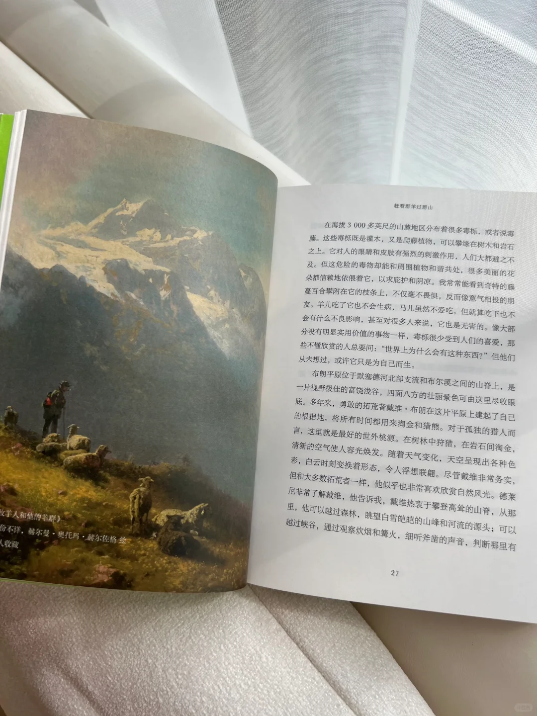 每一页文字美到都想摘抄一点也不夸张,群峰、湖泊、峡谷、草甸、流水、白云,每一处迷人的绿荫、月光、辽阔的空地、闪烁的瀑布之光和久违的山间阵雨,似乎一切近在眼前