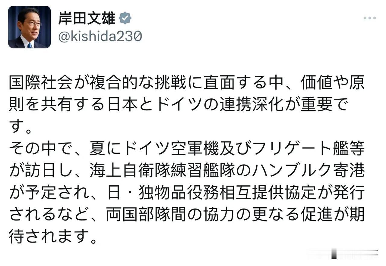 来自日本最新消息 就在今天!7月13日,日本首相岸田文雄发文表示,日本将深化与德国之间的合作,其中包括两国之间的军事交流。今年夏天德国的军机战舰将访问日本,而日本海上自卫队也有计划前往德国汉堡。 这真是个天大的消息,这才过了多少年?德日两国军机军舰又能够大摇大摆的走出去?他们这样的军事合作目的很显然,是要针对谁。美国的默许与放任不管,到头来会不会再次被反噬。