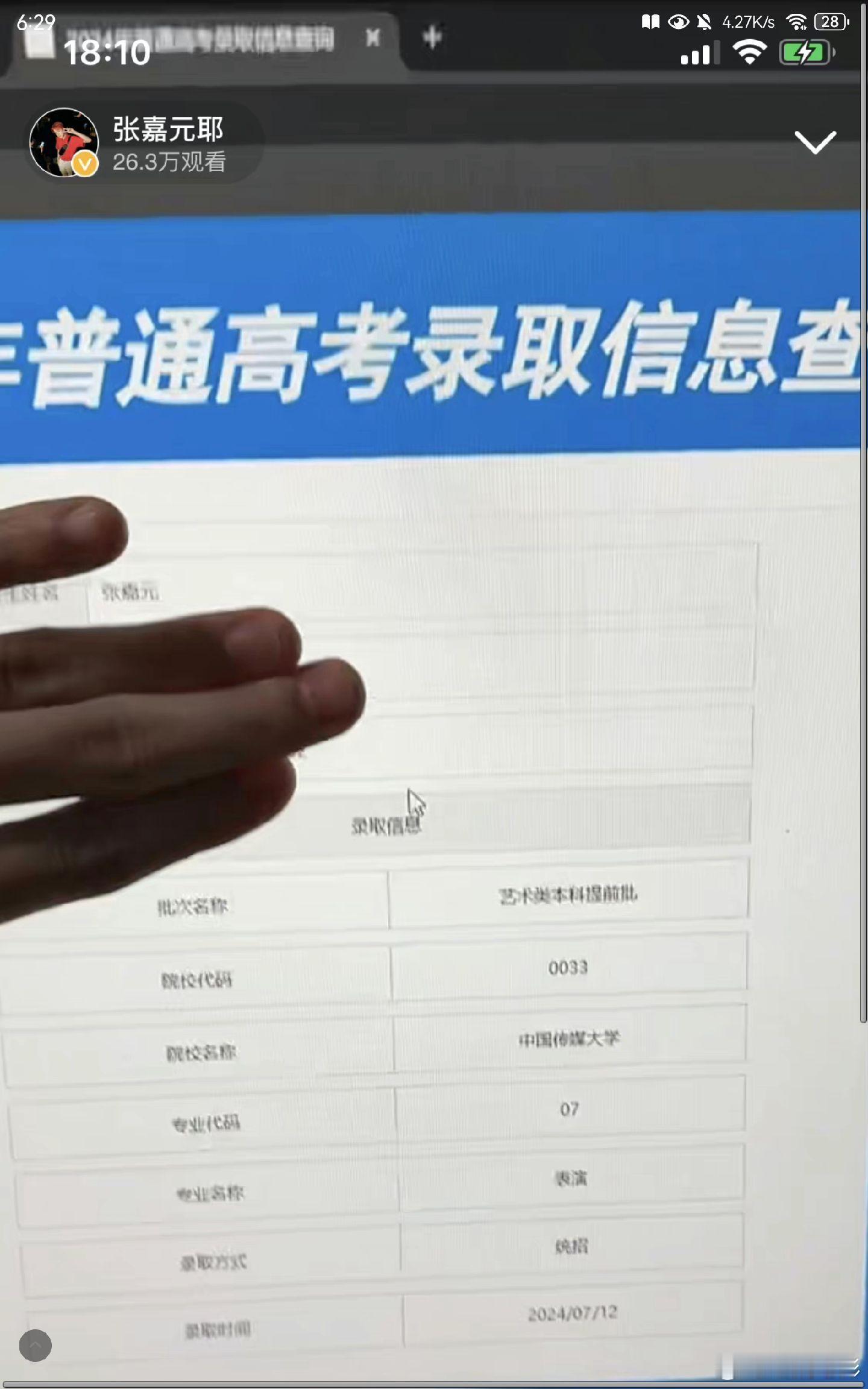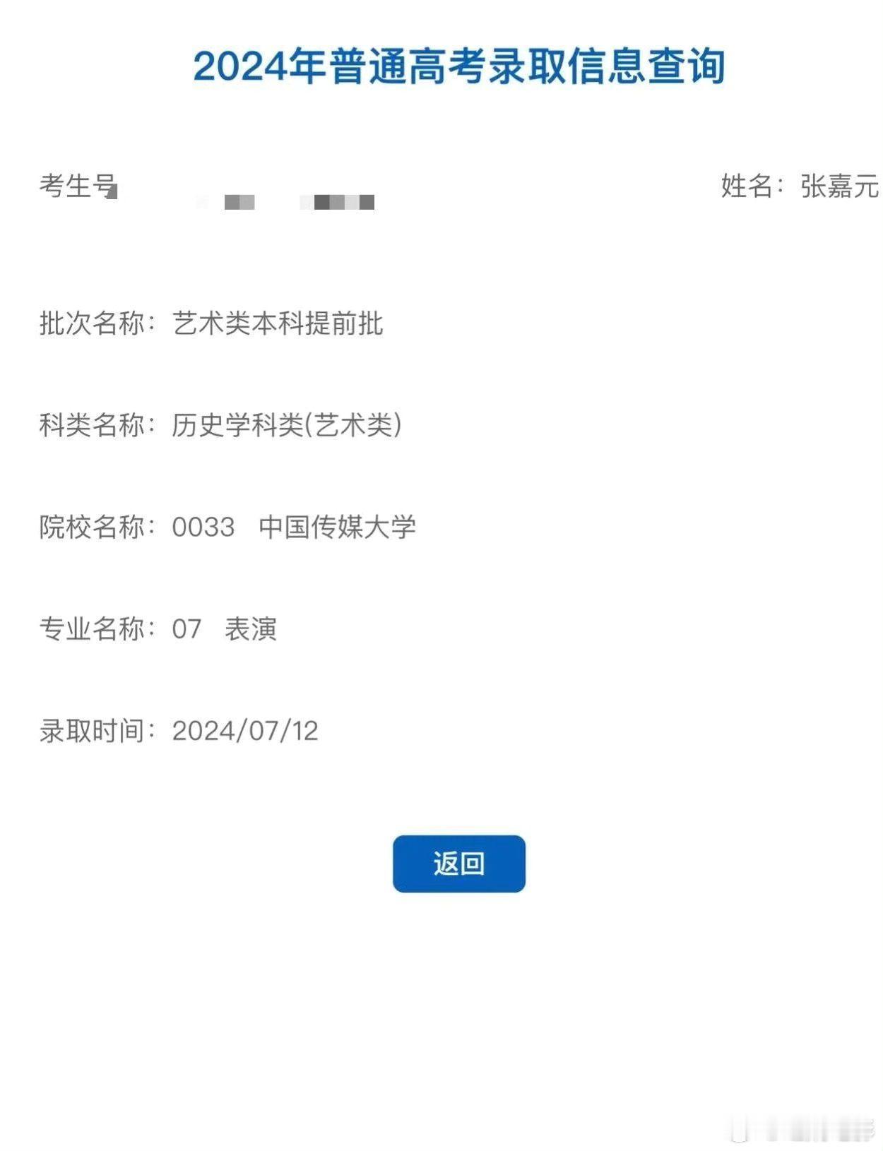 咱们嘉元也是准中传表演系学生了!恭喜。功夫不负有心人#张嘉元被中传录取了#