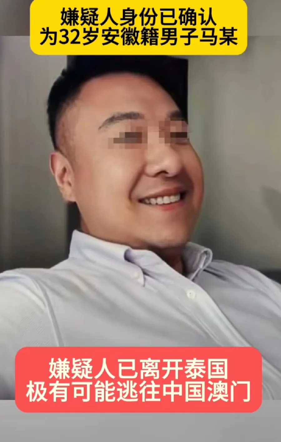 泰国杀害中国女同胞的,马严清(音),网传他在社交媒体上的照片,更年轻,与打马赛克的照片相比,除了鼻子不像,都很像,应该就是这个人了,一副成功人士的打扮,其实都是装出来的,人面兽心,为了100万,极其残忍杀害自己的同胞,可能最后也没拿到!出国在外,防火防盗防老乡!中国国籍,跑不远,快抓获了!
