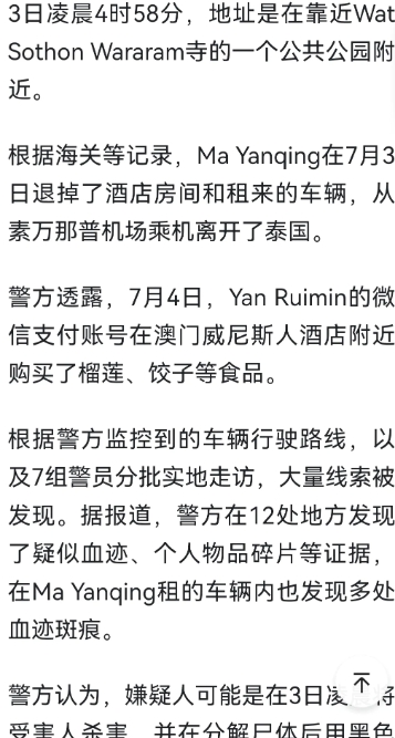 7月1日,该女子被男子带走。但该男子7月3日已经退掉租用车辆坐飞机离开泰国。7月4日女子的微信支付账号在澳门买了食品。