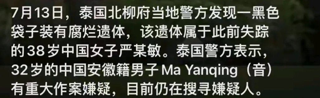 在泰国失踪遇害的中国女子又是中国人所为。被害女子38岁,而凶手32岁,两人是什么关系不可知,但两人认识。