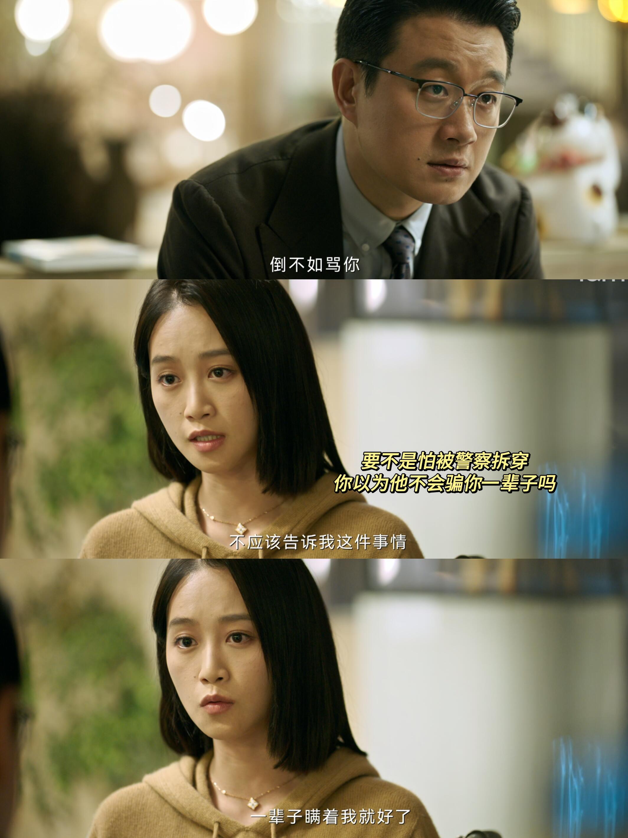 而在顾己鸣坦白劈腿时,她很淡定,甚至反问“难道骂你为了我放弃她吗”,这里就很明显的跟她之前人设悖论了,那么只有一种可能就是她早就知道顾劈腿而且还是那段在医院不能自由活动的时间,所有才有了后来她必须实时监视顾,以防再重演,毕竟他可以为了前途放弃江娜,现在有声望了,也会因为别的东西放弃自己,这也对应了为什么开始在沙发上真真说“你出名了我很害怕”之类的