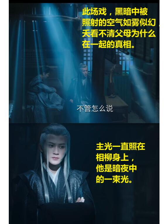 小夭来到离戎老伯住处,想要寻一些答案,可惜人已逝。多年的疑惑萦绕心间,如黑暗中被照射的空气一般,如雾似幻,父母在一起的真相是什么?而相柳,暗夜之光,照亮了小夭。注意这场戏光影的使用。