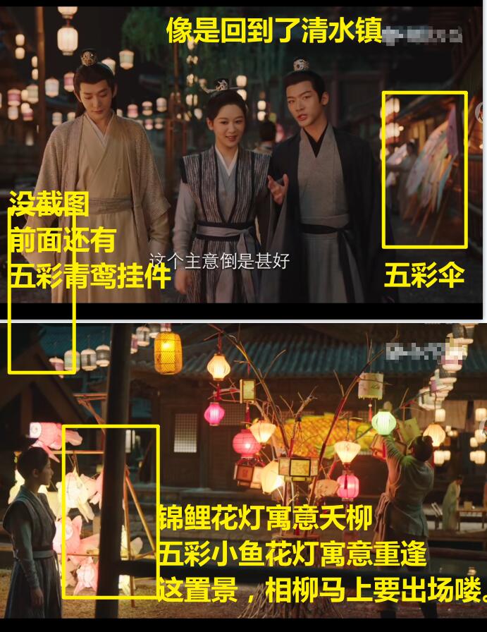 夜晚的轵邑城、寓意重逢的五彩伞和五彩小鱼花灯、寓意相思的青鸾挂件、寓意夭柳关系的锦鲤戏莲。那是不是告诉我们相柳会和小夭重逢呢?