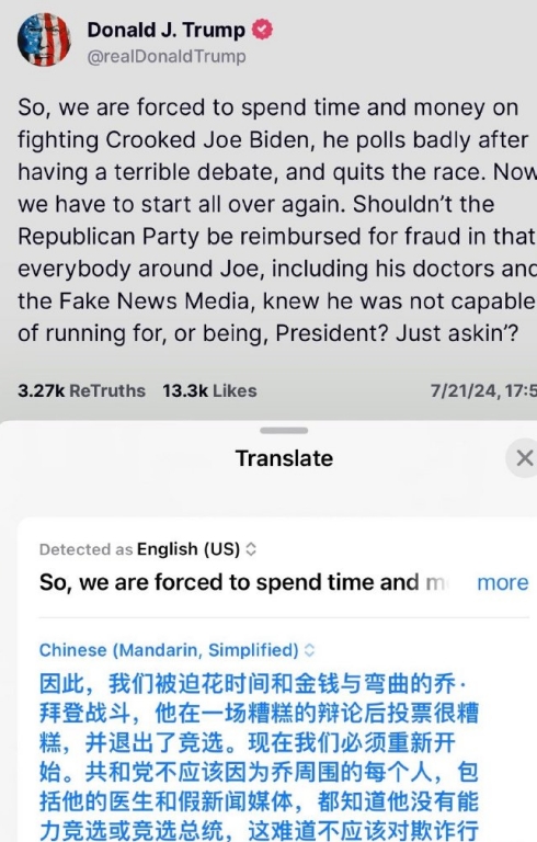拜登退选后,共和党开始敦促他下台,不能胜任总统候选人的话,那也不能胜任总统职位。特朗普连发N条推文: -说腐败的拜登被击倒了,我现在又要竞选第四次了! -真的有人相信拜登感人新冠了吗?不,从6月27号辩论之夜开始,他就想退出了,因为他完全被毁灭了。那一刻揭示了拜登的无能,他根本不应该当选美国总统,他正在摧毁我们的国家。 -我们被迫花费时间和金钱与拜登战斗,而他在糟糕的辩论后退出竞选。现在我们必须重新开始,共和党应该为这种欺诈行为得到赔偿。