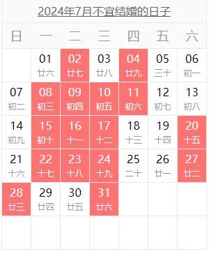 2024年7月份宜结婚和不宜结婚的日子,整体来说不宜结婚的日子多。