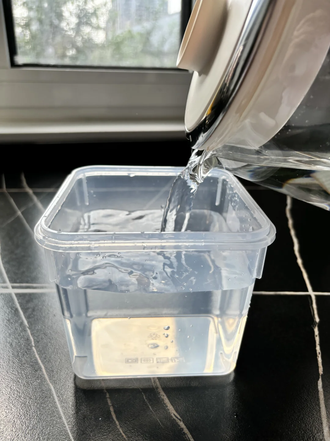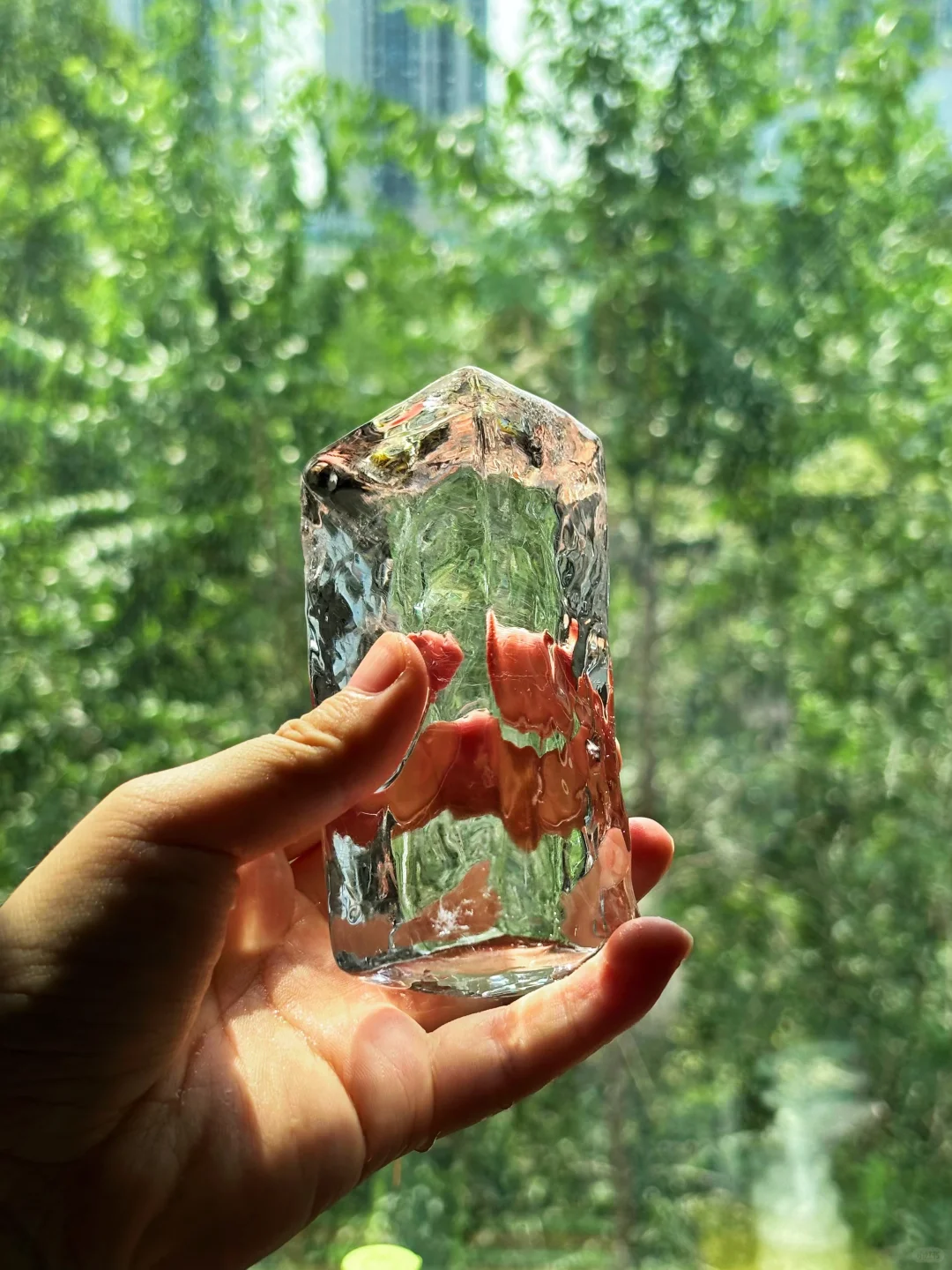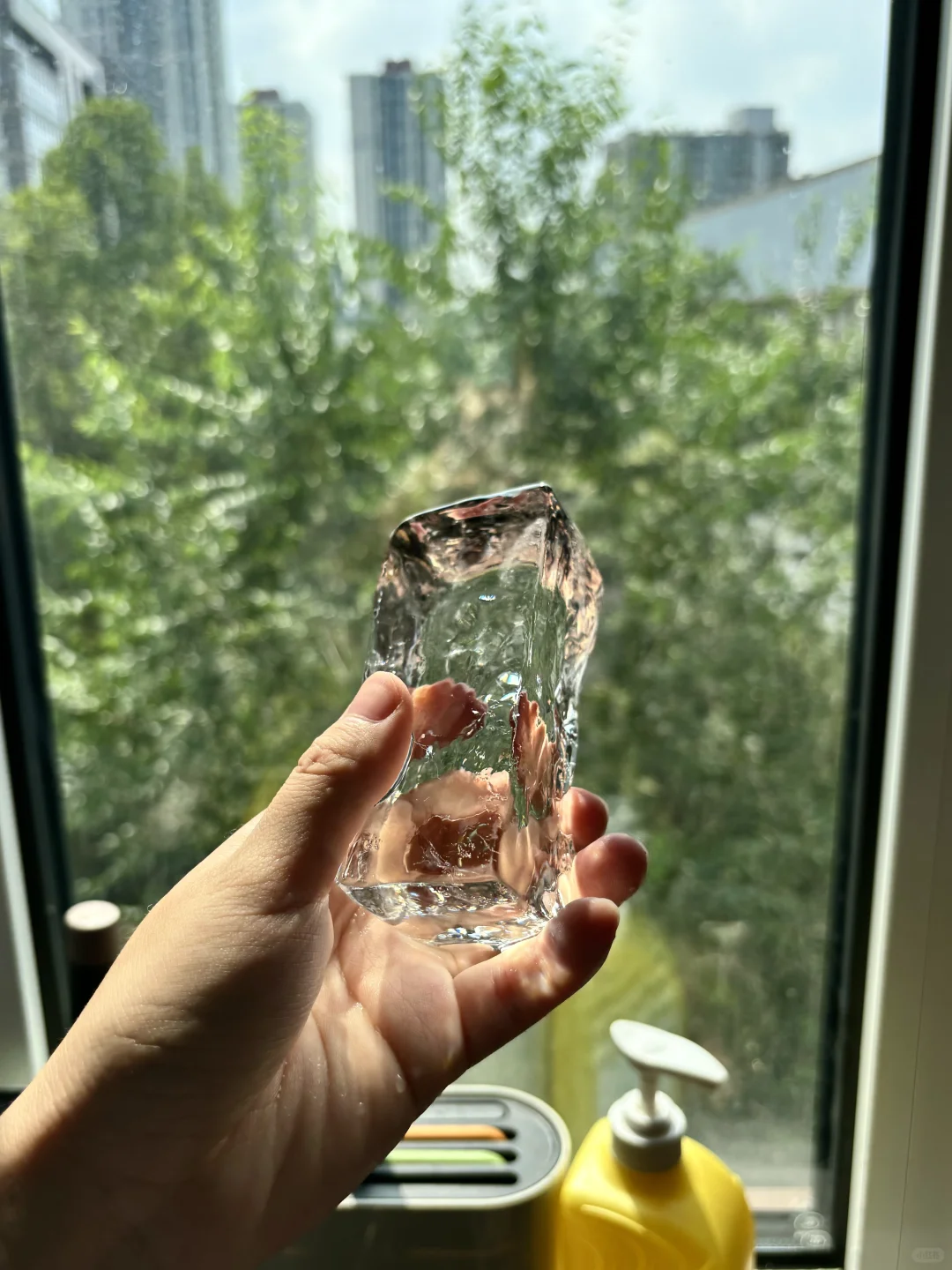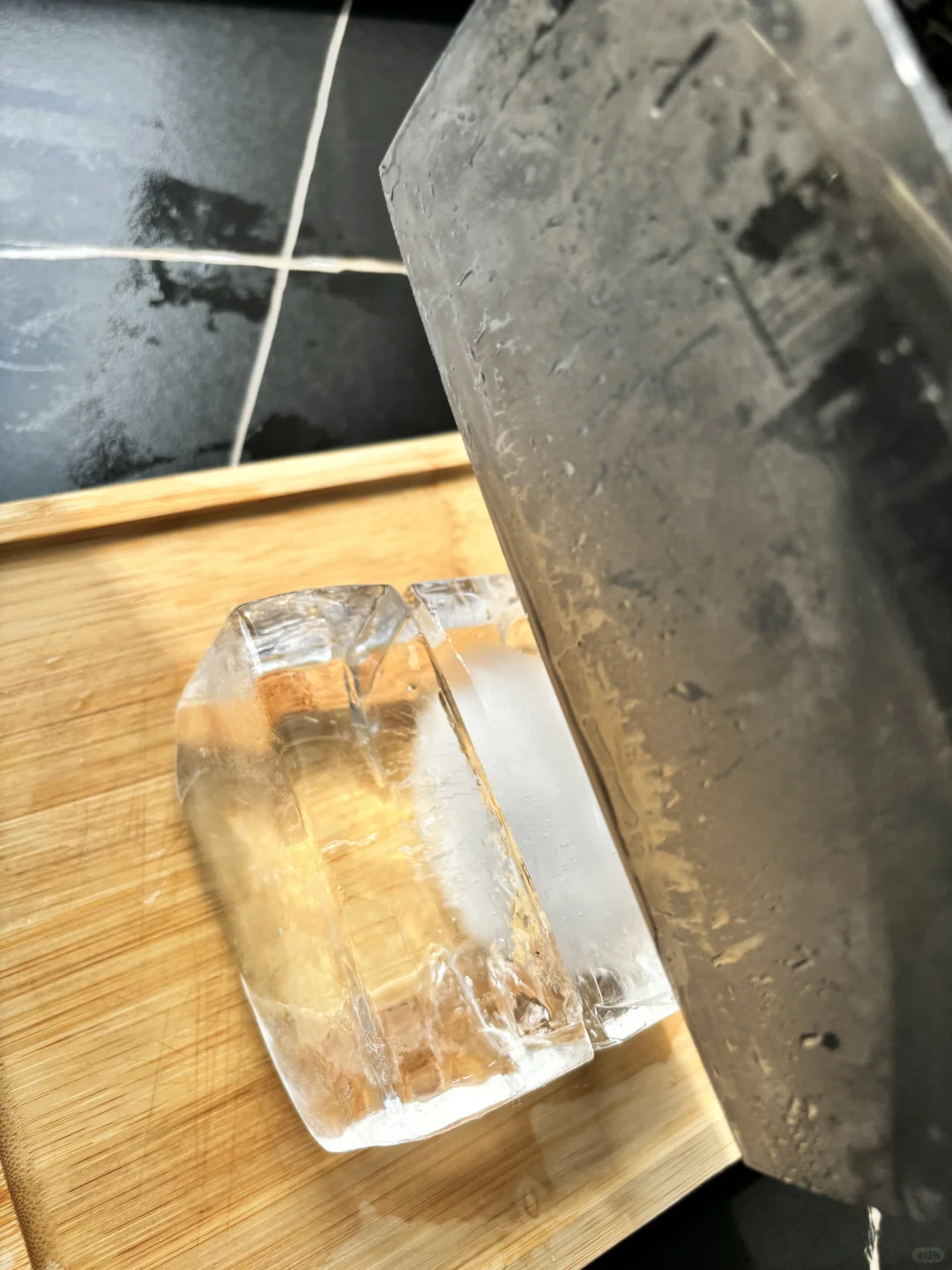 喝完的酸奶盒冻冰块大小正好,不用买冰块盒子了😊 倒入凉白开放冰箱冷冻一晚,冻成大冰块后拿刀划一会,把气泡的切掉就是高透冰了~~ ‼️⚠️切记: 带个隔热手套哦,防止冻伤,也防止伤到手,冰块还是挺滑的!